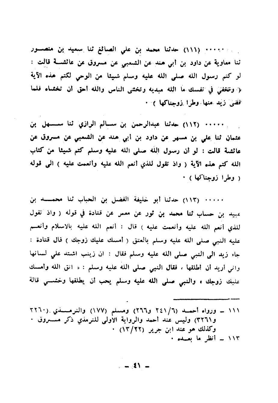 111 - حَدَّثَنَا مُحَمَّدُ بْنُ عَلِيٍّ الصَّائِغُ، ثنا سَعِيدُ بْنُ مَنْصُورٍ، ثنا مُعَاوِيَةُ، عَنْ دَاوُدَ بْنِ أَبِي هِنْدٍ، عَنِ الشَّعْبِيِّ، عَنْ مَسْرُوقٍ، عَنْ عَائِشَةَ، قَالَتْ: " §لَوْ كَتَمَ رَسُولُ اللهِ صَلَّى اللهُ عَلَيْهِ وَسَلَّمَ شَيْئًا مِنَ الْوَحْيِ لَكَتَمَ هَذِهِ الْآيَةَ: {وَتُخْفِي فِي نَفْسِكَ مَا اللهُ مُبْدِيهِ وَتَخْشَى النَّاسَ وَاللهُ أَحَقُّ أَنْ تَخْشَاهُ، فَلَمَّا قَضَى زَيْدٌ مِنْهَا وَطَرًا زَوَّجْنَاكَهَا} [الأحزاب: 37] "