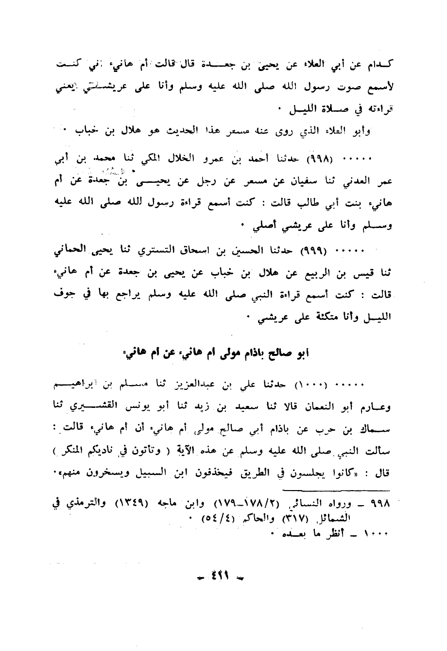 998 - حَدَّثَنَا أَحْمَدُ بْنُ عَمْرٍو الْخَلَّالُ الْمَكِّيُّ، ثنا مُحَمَّدُ بْنُ أَبِي عُمَرَ الْعَدَنِيُّ، ثنا سُفْيَانُ، عَنْ مِسْعَرٍ، عَنْ رَجُلٍ، عَنْ يَحْيَى بْنِ جَعْدَةَ، عَنْ أُمِّ هَانِئٍ بِنْتِ أَبِي طَالِبٍ، قَالَتْ: «كُنْتُ §أَسْمَعُ قِرَاءَةَ رَسُولِ اللهِ صَلَّى اللهُ عَلَيْهِ وَسَلَّمَ وَأَنَا عَلَى عَرِيشِي أُصَلِّي»