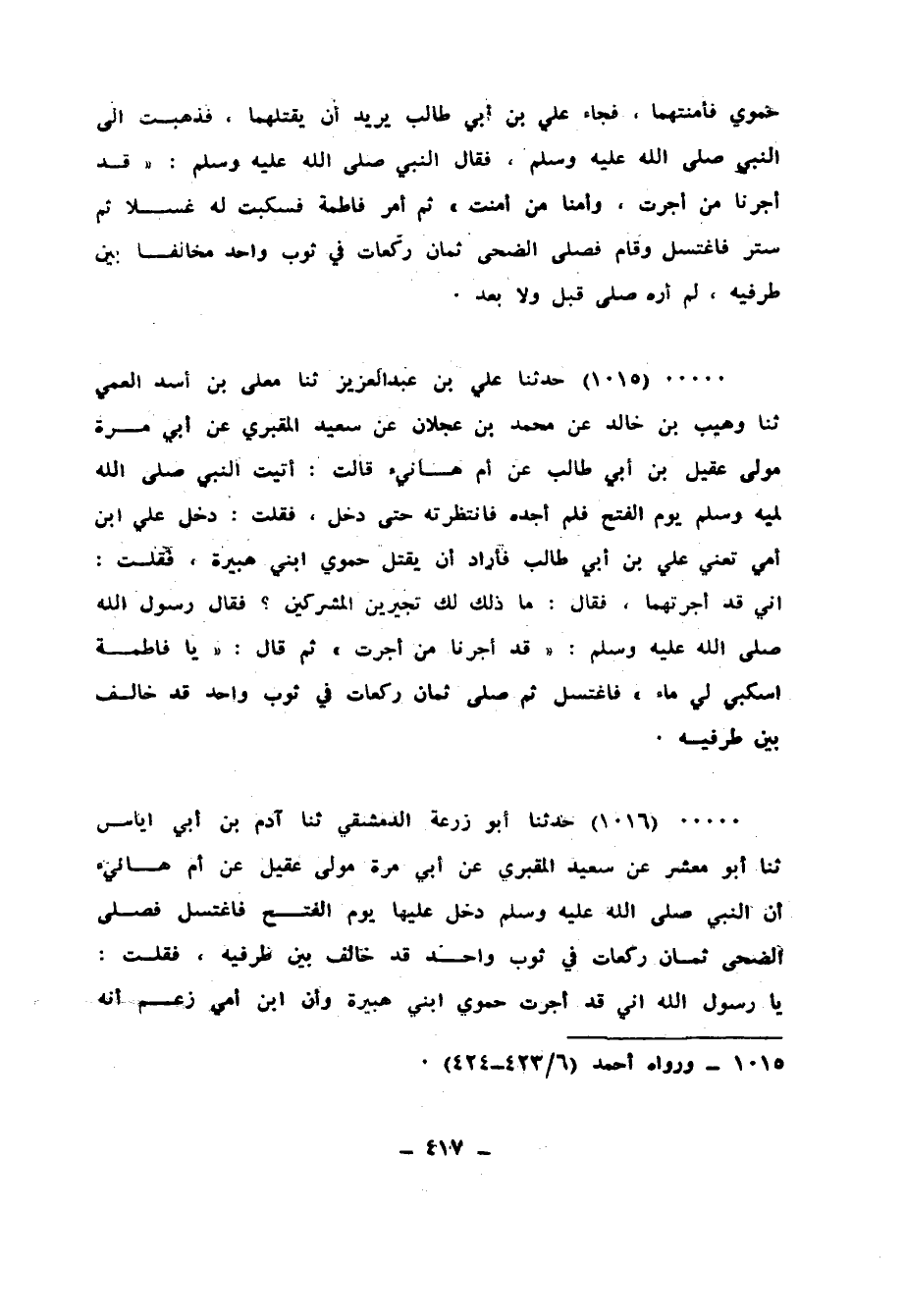 1015 - حَدَّثَنَا عَلِيُّ بْنُ عَبْدِ الْعَزِيزِ، ثنا مُعَلَّى بْنُ أَسَدٍ الْعَمَيُّ، ثنا وُهَيْبُ بْنُ خَالِدٍ، عَنْ مُحَمَّدِ بْنِ عَجْلَانَ، عَنْ سَعِيدٍ الْمَقْبُرِيِّ، عَنْ أَبِي مُرَّةَ، مَوْلَى عَقِيلِ بْنِ أَبِي طَالِبٍ، عَنْ أُمِّ هَانِئٍ، قَالَتْ: أَتَيْتُ النَّبِيَّ صَلَّى اللهُ عَلَيْهِ وَسَلَّمَ يَوْمَ الْفَتْحِ فَلَمْ أَجِدُهُ، فَانْتَظَرْتُهُ حَتَّى دَخَلَ، فَقُلْتُ: دَخَلَ عَلِيَّ ابْنُ أُمِّي، تَعْنِي عَلِيَّ بْنَ أَبِي طَالِبٍ، فَأَرَادَ أَنْ يَقْتُلَ حَمَوَيَّ ابْنِيْ هُبَيْرَةَ، فَقُلْتُ: إِنِّي قَدْ أَجَرْتُهُما، فَقَالَ: مَا ذَلِكَ لَكِ، تُجِيرِينَ الْمُشْرِكِينَ؟ فَقَالَ رَسُولُ اللهِ صَلَّى اللهُ عَلَيْهِ وَسَلَّمَ: «قَدْ §أَجَرْنَا مَنْ أَجَرْتِ» ، ثُمَّ قَالَ: «يَا فَاطِمَةُ، اسْكُبِي لِي مَاءً فَاغْتَسَلَ» ، ثُمَّ صَلَّى ثَمَانِ رَكَعَاتٍ فِي ثَوْبٍ وَاحِدٍ قَدْ خَالَفَ بَيْنَ طَرَفَيْهِ