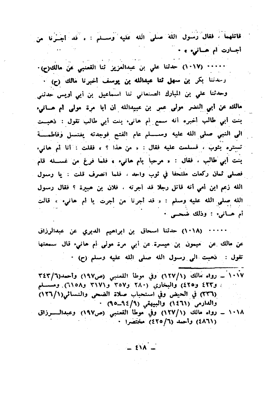1017 - حَدَّثَنَا عَلِيُّ بْنُ عَبْدِ الْعَزِيزِ، ثنا الْقَعْنَبِيُّ، عَنْ مَالِكٍ، ح وَحَدَّثَنَا بَكْرُ بْنُ سَهْلٍ، ثنا عَبْدُ اللهِ بْنُ يُوسُفَ، أَخْبَرَنَا مَالِكٌ، ح وَحَدَّثَنَا عَلِيُّ بْنُ الْمُبَارَكِ الصَّنْعَانِيُّ، ثنا إِسْمَاعِيلُ بْنُ أَبِي أُوَيْسٍ، حَدَّثَنِي مَالِكٌ، عَنْ أَبِي النَّضْرِ، مَوْلَى عُمَرَ بْنِ عُبَيْدِ اللهِ، أَنَّ أَبَا مُرَّةَ، مَوْلَى أُمِّ هَانِئٍ بِنْتِ أَبِي طَالِبٍ أَخْبَرَهُ، أَنَّهُ سَمِعَ أُمَّ هَانِئٍ بِنْتَ أَبِي طَالِبٍ، تَقُولُ: ذَهَبْتُ إِلَى النَّبِيِّ صَلَّى اللهُ عَلَيْهِ وَسَلَّمَ عَامَ الْفَتْحِ فَوَجَدْتُهُ يَغْتَسِلُ، وَفَاطِمَةُ تَسْتُرُهُ بِثَوْبٍ، فَسَلَّمْتُ عَلَيْهِ، فَقَالَ: «مَنْ هَذَا؟» فَقُلْتُ: أَنَا أُمُّ هَانِئٍ بِنْتُ أَبِي طَالِبٍ، فَقَالَ: «مَرْحَبًا بِأُمِّ هَانِئٍ» ، فَلَمَّا فَرَغَ مِنْ غُسْلِهِ قَامَ فَصَلَّى ثَمَانِ رَكَعَاتٍ مُلْتَحِفًا فِي ثَوْبٍ وَاحِدٍ، فَلَمَّا انْصَرَفَ قُلْتُ: يَا رَسُولَ اللهِ، زَعَمَ ابْنُ أُمِّي أَنَّهُ قَاتِلٌ رَجُلًا قَدْ أَجَرْتُهُ، فُلَانُ ابْنُ هُبَيْرَةَ، فَقَالَ رَسُولُ اللهِ صَلَّى اللهُ عَلَيْهِ وَسَلَّمَ: «قَدْ §أَجَرْنَا مَنْ أَجَرْتِ يَا أُمَّ هَانِئٍ» ، قَالَتْ أُمُّ هَانِئٍ: وَذَلِكَ ضُحًى