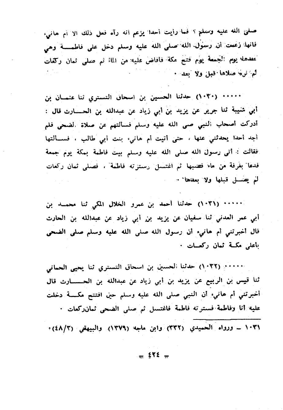1032 - حَدَّثَنَا الْحُسَيْنُ بْنُ إِسْحَاقَ التُّسْتَرِيُّ، ثنا يَحْيَى الْحِمَّانِيُّ، ثنا قَيْسُ بْنُ الرَّبِيعِ، عَنْ يَزِيدَ بْنِ أَبِي زِيَادٍ، عَنْ عَبْدِ اللهِ بْنِ الْحَارِثِ، قَالَ: أَخْبَرَتْنِي أُمُّ هَانِئٍ، «أَنَّ النَّبِيَّ صَلَّى اللهُ عَلَيْهِ وَسَلَّمَ حِينَ افْتَتَحَ مَكَّةَ دَخَلْتُ عَلَيْهِ أَنَا وَفَاطِمَةُ، فَسَتَرَتْهُ فَاطِمَةُ §فَاغْتَسَلَ، ثُمَّ صَلَّى الضُّحَى ثَمَانِ رَكَعَاتٍ»