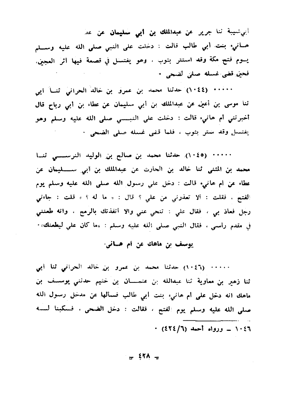 1046 - حَدَّثَنَا مُحَمَّدُ بْنُ عَمْرِو بْنِ خَالِدٍ الْحَرَّانِيُّ، ثنا أَبِي، ثنا زُهَيْرُ بْنُ مُعَاوِيَةَ، ثنا عَبْدُ اللهِ بْنُ عُثْمَانَ بْنِ خُثَيْمٍ، حَدَّثَنِي يُوسُفُ بْنُ مَاهَكَ، أَنَّهُ دَخَلَ عَلَى أُمِّ هَانِئٍ بِنْتِ أَبِي طَالِبٍ، فَسَأَلَهَا عَنْ مَدْخَلِ رَسُولِ اللهِ صَلَّى اللهُ عَلَيْهِ وَسَلَّمَ يَوْمَ الْفَتْحِ، فَقَالَتْ: " §دَخَلَ الضُّحَى فَسَكَبْنا لَهُ مَاءً فِي صَحْفَةٍ لَنَا، إِنِّي لَأَرَى فِيهَا وَضَرُ الْعَجِينِ - قَالَ يُوسُفُ: لَا أَدْرِي أَيُّ ذَلِكَ أَخْبَرَتْنِي: أَتَوَضَّأَ أَمِ اغْتَسَلَ - ثُمَّ رَكَعَ فِي هَذَا الْمَسْجِدِ لِمَسْجِدٍ فِي بَيْتِهَا أَرْبَعَ رَكَعَاتٍ "
