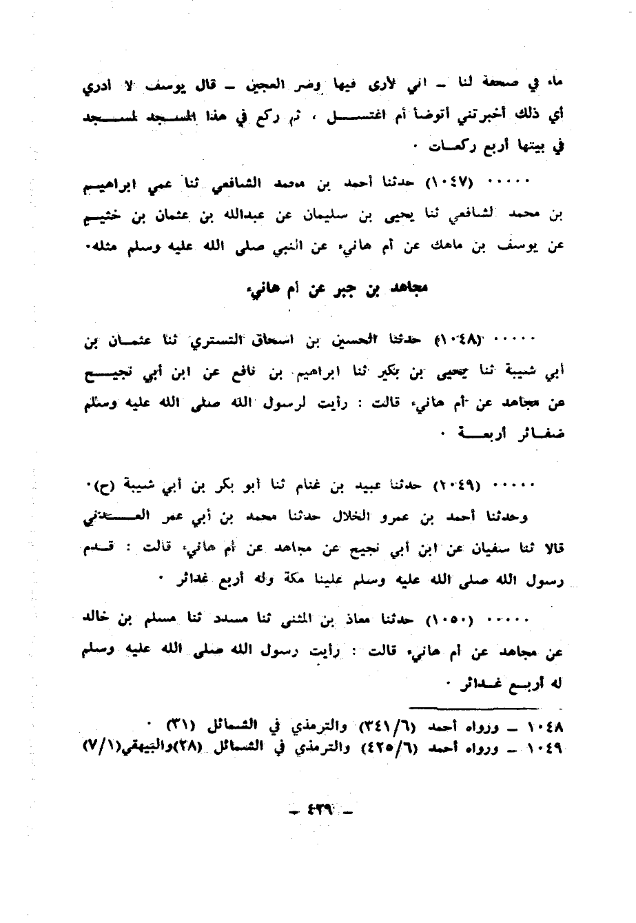 1050 - حَدَّثَنَا مُعَاذُ بْنُ الْمُثَنَّى، ثنا مُسَدَّدٌ، ثنا مُسْلِمُ بْنُ خَالِدٍ، عَنْ مُجَاهِدٍ، عَنْ أُمِّ هَانِئٍ، قَالَتْ: «رَأَيْتُ رَسُولَ اللهِ صَلَّى اللهُ عَلَيْهِ وَسَلَّمَ §لَهُ أَرْبَعُ غَدَائِرَ»