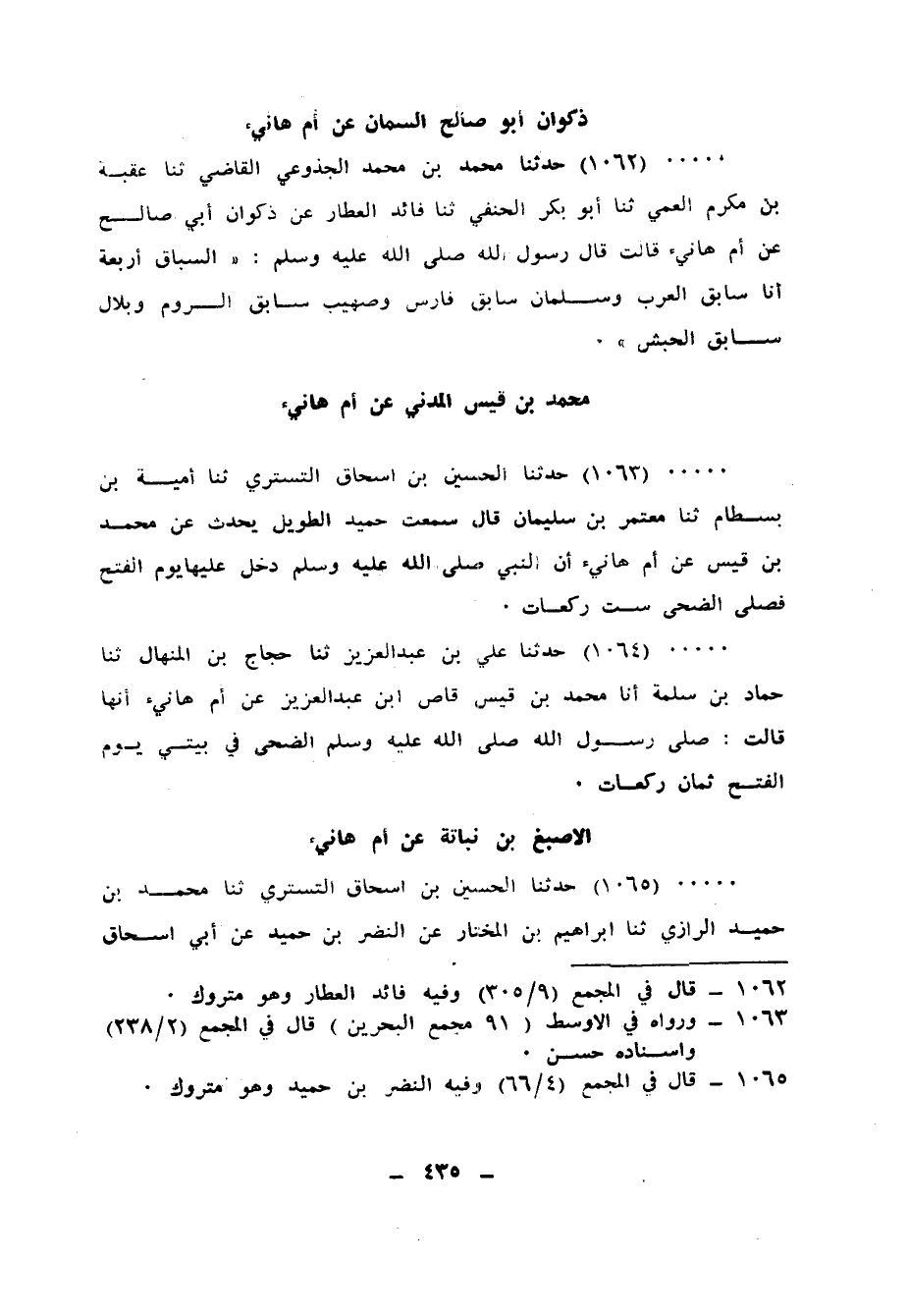 1063 - حَدَّثَنَا الْحُسَيْنُ بْنُ إِسْحَاقَ التُّسْتَرِيُّ، ثنا أُمَيَّةُ بْنُ بِسْطَامٍ، ثنا مُعْتَمِرُ بْنُ سُلَيْمَانَ، قَالَ: سَمِعْتُ حُمَيْدًا الطَّوِيلَ يُحَدِّثُ، عَنْ مُحَمَّدِ بْنِ قَيْسٍ، عَنْ أُمِّ هَانِئٍ، «أَنَّ النَّبِيَّ صَلَّى اللهُ عَلَيْهِ وَسَلَّمَ دَخَلَ عَلَيْهَا §يَوْمَ الْفَتْحِ فَصَلَّى الضُّحَى سِتَّ رَكَعَاتٍ»