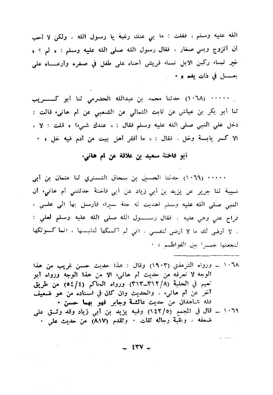 1069 - حَدَّثَنَا الْحُسَيْنُ بْنُ إِسْحَاقَ التُّسْتَرِيُّ، ثنا عُثْمَانُ بْنُ أَبِي شَيْبَةَ، ثنا جَرِيرٌ، عَنْ يَزِيدَ بْنِ أَبِي زِيَادٍ، عَنْ أَبِي فَاخِتَةَ، حَدَّثَتْنِي أُمُّ هَانِئٍ، أَنَّ النَّبِيَّ صَلَّى اللهُ عَلَيْهِ وَسَلَّمَ §أُهْدِيَتْ لَهُ حُلَّةٌ سِيَرَاءُ فَأَرْسَلَ بِهَا إِلَى عَلِيٍّ، فَرَاحَ عَلِيٌّ وَهِيَ عَلَيْهِ، فَقَالَ رَسُولُ اللهِ صَلَّى اللهُ عَلَيْهِ وَسَلَّمَ لِعَلِيٍّ: «لَا أَرْضَى لَكَ مَا لَا أَرْضَى لِنَفْسِي، إِنِّي لَمْ أَكْسُكَهَا لِتَلْبَسَهَا، إِنَّمَا كَسَوْتُكَهَا لِتَجْعَلُها خُمْرًا بَيْنَ الْفَوَاطِمِ»