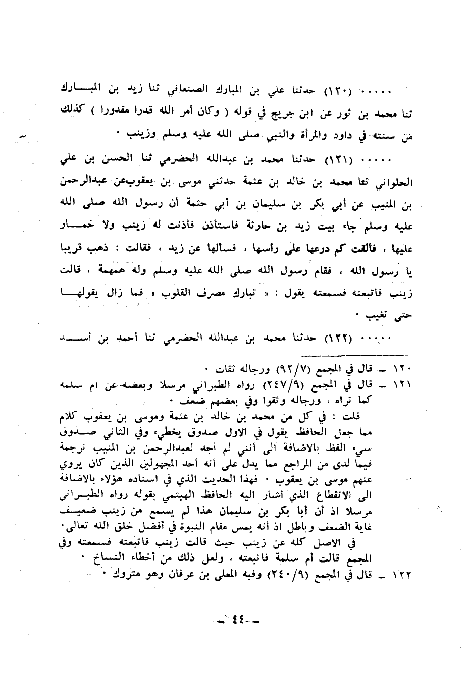 121 - حَدَّثَنَا مُحَمَّدُ بْنُ عَبْدِ اللهِ الْحَضْرَمِيُّ، ثنا الْحَسَنُ بْنُ عَلِيٍّ الْحُلْوَانِيُّ، ثنا مُحَمَّدُ بْنُ خَالِدِ بْنِ عَثْمَةَ، حَدَّثَنِي مُوسَى بْنُ يَعْقُوبَ، عَنْ عَبْدِ الرَّحْمَنِ بْنِ الْمُنِيبِ، عَنْ أَبِي بَكْرِ بْنِ سُلَيْمَانَ بْنِ أَبِي حَثْمَةَ، أَنَّ رَسُولَ اللهِ صَلَّى اللهُ عَلَيْهِ وَسَلَّمَ جَاءَ بَيْتَ زَيْدِ بْنِ حَارِثَةَ فَاسْتَأْذَنَ، فَأَذِنَتْ لَهُ زَيْنَبَ وَلَا خِمَارَ عَلَيْهَا، فَأَلْقَتْ كُمَّ دِرْعِهَا عَلَى رَأْسِهَا، فَسَأَلَهَا عَنْ زَيْدٍ، فَقَالَتْ: ذَهَبَ قَرِيبًا يَا رَسُولَ اللهِ، فَقَامَ رَسُولُ اللهِ صَلَّى اللهُ عَلَيْهِ وَسَلَّمَ وَلَهُ هَمْهَمَةٌ، قَالَتْ زَيْنَبُ: فَاتَّبَعْتُهُ فَسَمِعْتُهُ يَقُولُ: «§تَبَارَكَ مُصَرِّفُ الْقُلُوبِ» فَمَا زَالَ يَقُولُهَا حَتَّى تَغَيَّبَ
