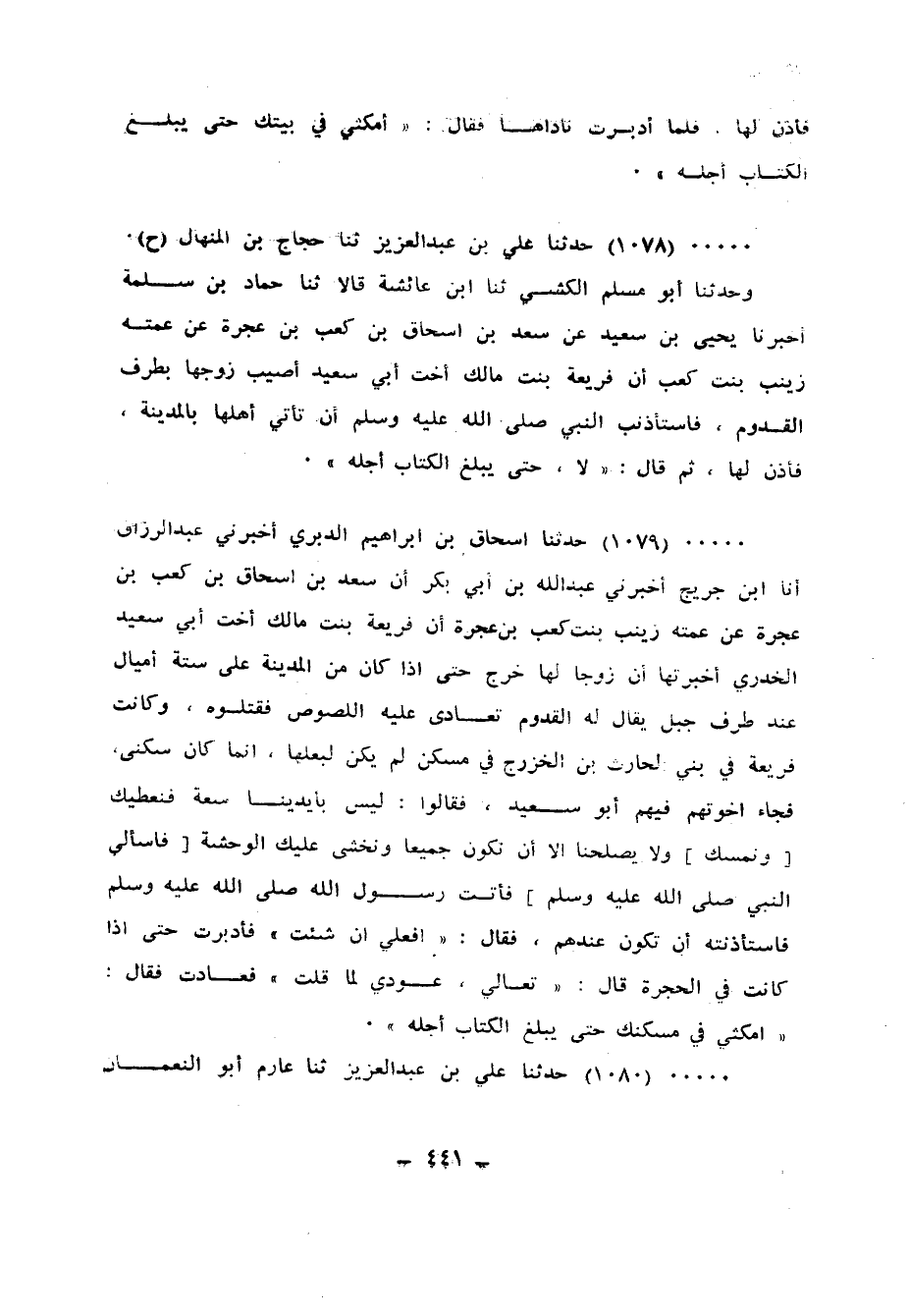 1079 - حَدَّثَنَا إِسْحَاقُ بْنُ إِبْرَاهِيمَ الدَّبَرِيُّ، أَخْبَرَنِي عَبْدُ الرَّزَّاقِ، أَنَا ابْنُ جُرَيْجٍ، أَخْبَرَنِي عَبْدُ اللهِ بْنُ أَبِي بَكْرٍ، أَنَّ سَعْدَ بْنَ إِسْحَاقَ بْنِ كَعْبِ بْنِ عُجْرَةَ، عَنْ عَمَّتِهِ زَيْنَبَ بِنْتِ كَعْبِ بْنِ عُجْرَةَ، أَنَّ فُرَيْعَةَ بِنْتَ مَالِكٍ، أُخْتَ أَبِي سَعِيدٍ الْخُدْرِيِّ، أَخْبَرَتْهَا: أَنَّ زَوْجًا لَهَا خَرَجَ حَتَّى إِذَا كَانَ مِنَ الْمَدِينَةِ عَلَى سِتَّةِ أَمْيَالٍ عِنْدَ طَرَفِ جَبَلٍ يُقَالُ لَهُ الْقُدُومُ، تَعَادَى عَلَيْهِ اللُّصُوصُ فَقَتَلُوهُ، وَكَانَتْ فُرَيْعَةُ فِي بَنِي الْحَارِثِ بْنِ الْخَزْرَجِ فِي مَسْكَنٍ لَمْ يَكُنْ لِبَعْلِها، إِنَّمَا كَانَ سُكْنَى، فَجَاءَ إِخْوَتُهُمْ فِيهِمْ أَبُو سَعِيدٍ، فَقَالُوا: لَيْسَ بِأَيْدِينَا سَعَةً فَنُعْطِيكِ ونُمْسِكُ، وَلَا يُصْلِحُنَا إِلَّا أَنْ نَكُونَ جَمِيعًا، ونَخْشَى عَلَيْكِ الْوَحْشَةَ، فَاسْأَلِي النَّبِيَّ صَلَّى اللهُ عَلَيْهِ وَسَلَّمَ، فَأَتَتْ رَسُولَ اللهِ صَلَّى اللهُ عَلَيْهِ وَسَلَّمَ فَاسْتَأْذَنَتْهُ أَنْ تَكُونَ عِنْدَهُمْ، فَقَالَ: «افْعَلِي إِنْ شِئْتِ» ، فَأَدْبَرَتْ حَتَّى إِذَا كَانَتْ فِي الْحُجْرَةِ، قَالَ: «تَعَالَيْ عُودِي لِمَا قُلْتِ» ، فَعَادَتْ، فَقَالَ: «§امْكُثِي فِي مَسْكَنِكِ حَتَّى يَبْلُغَ الْكِتَابُ أَجَلَهُ»