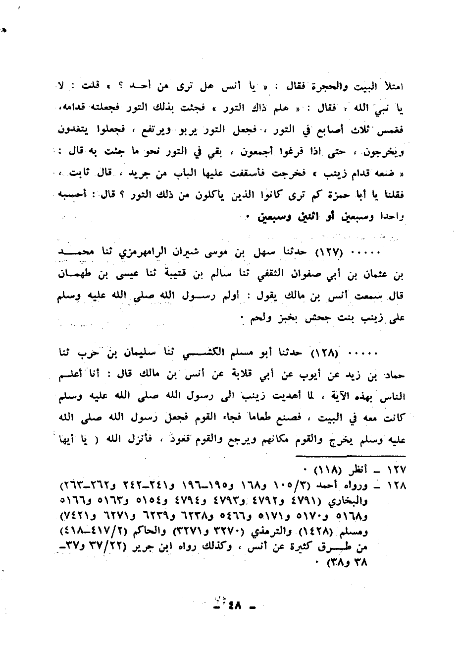 128 - حَدَّثَنَا أَبُو مُسْلِمٍ الْكَشِّيُّ، ثنا سُلَيْمَانُ بْنُ حَرْبٍ، ثنا حَمَّادُ بْنُ زَيْدٍ، عَنْ أَيُّوبَ، عَنْ أَبِي قِلَابَةَ، عَنْ أَنَسِ بْنِ مَالِكٍ، قَالَ: أَنَا أَعْلَمُ النَّاسِ بِهَذِهِ الْآيَةِ، " لَمَّا أُهْدِيَتْ زَيْنَبُ إِلَى رَسُولِ اللهِ صَلَّى اللهُ عَلَيْهِ وَسَلَّمَ كَانَتْ مَعَهُ فِي الْبَيْتِ، فَصَنَعَ طَعَامًا فَجَاءَ الْقَوْمُ فَجَعَلَ رَسُولُ اللهِ صَلَّى اللهُ عَلَيْهِ وَسَلَّمَ يَخْرُجُ وَالْقَوْمُ مَكَانَهُمْ، وَيَرْجِعُ وَالْقَوْمُ قُعُودٌ، فَأَنْزَلَ اللهُ: {§يَا أَيُّهَا الَّذِينَ آمَنُوا لَا تَدْخُلُوا بُيُوتَ النَّبِيِّ إِلَّا أَنْ يُؤْذَنَ لَكُمْ إِلَى طَعَامٍ غَيْرَ نَاظِرِينَ إِنَاهُ وَلَكِنْ إِذَا دُعِيتُمْ فَادْخُلُوا، فَإِذَا طَعِمْتُمْ فَانْتَشِرُوا وَلَا مُسْتَأْنِسِينَ لِحَدِيثٍ إِنَّ ذَلِكُمْ كَانَ يُؤْذِي النَّبِيَّ فَيَسْتَحِيِي مِنْكُمْ وَاللهُ لَا يَسْتَحِيِي مِنَ الْحَقِّ، وَإِذَا سَأَلْتُمُوهُنَّ مَتَاعًا فَاسْأَلُوهُنَّ مِنْ وَرَاءِ حِجَابٍ} [الأحزاب: 53] ، فَضَرَبَ رَسُولُ اللهِ صَلَّى اللهُ عَلَيْهِ وَسَلَّمَ الْحِجَابَ وَقَامَ الْقَوْمُ "
