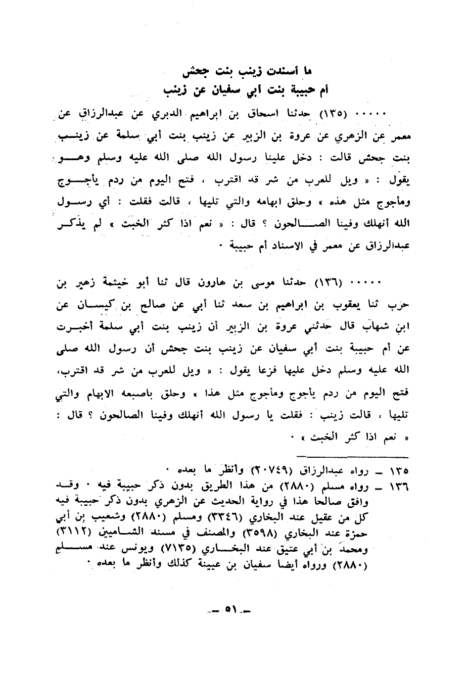 136 - حَدَّثَنَا مُوسَى بْنُ هَارُونَ، قَالَ: ثنا أَبُو خَيْثَمَةَ زُهَيْرُ بْنُ حَرْبٍ، ثنا يَعْقُوبُ بْنُ إِبْرَاهِيمَ بْنِ سَعْدٍ، ثنا أَبِي، عَنْ صَالِحِ بْنِ كَيْسَانَ، عَنِ ابْنِ شِهَابٍ، قَالَ: حَدَّثَنِي عُرْوَةُ بْنُ الزُّبَيْرِ، أَنَّ زَيْنَبَ بِنْتَ أَبِي سَلَمَةَ أَخْبَرَتْ، عَنْ أُمِّ حَبِيبَةَ بِنْتِ أَبِي سُفْيَانَ، عَنْ زَيْنَبَ بِنْتِ جَحْشٍ، أَنَّ رَسُولَ اللهِ صَلَّى اللهُ عَلَيْهِ وَسَلَّمَ دَخَلَ عَلَيْهَا فَزِعًا يَقُولُ: «§وَيْلٌ لِلْعَرَبِ مِنْ شَرٍّ قَدِ اقْتَرَبَ، فُتِحَ الْيَوْمَ مِنْ رَدْمِ يَأْجُوجَ وَمَأْجُوجَ مِثْلُ هَذَا وَحَلَّقَ بِأَصْبُعِهِ الْإِبْهَامِ وَالَّتِي تَلِيهَا» قَالَتْ زَيْنَبُ: فَقُلْتُ: يَا رَسُولَ اللهِ أَنَهْلِكُ وَفِينَا الصَّالِحُونَ؟ قَالَ: «نَعَمْ إِذَا كَثُرَ الْخَبَثُ»