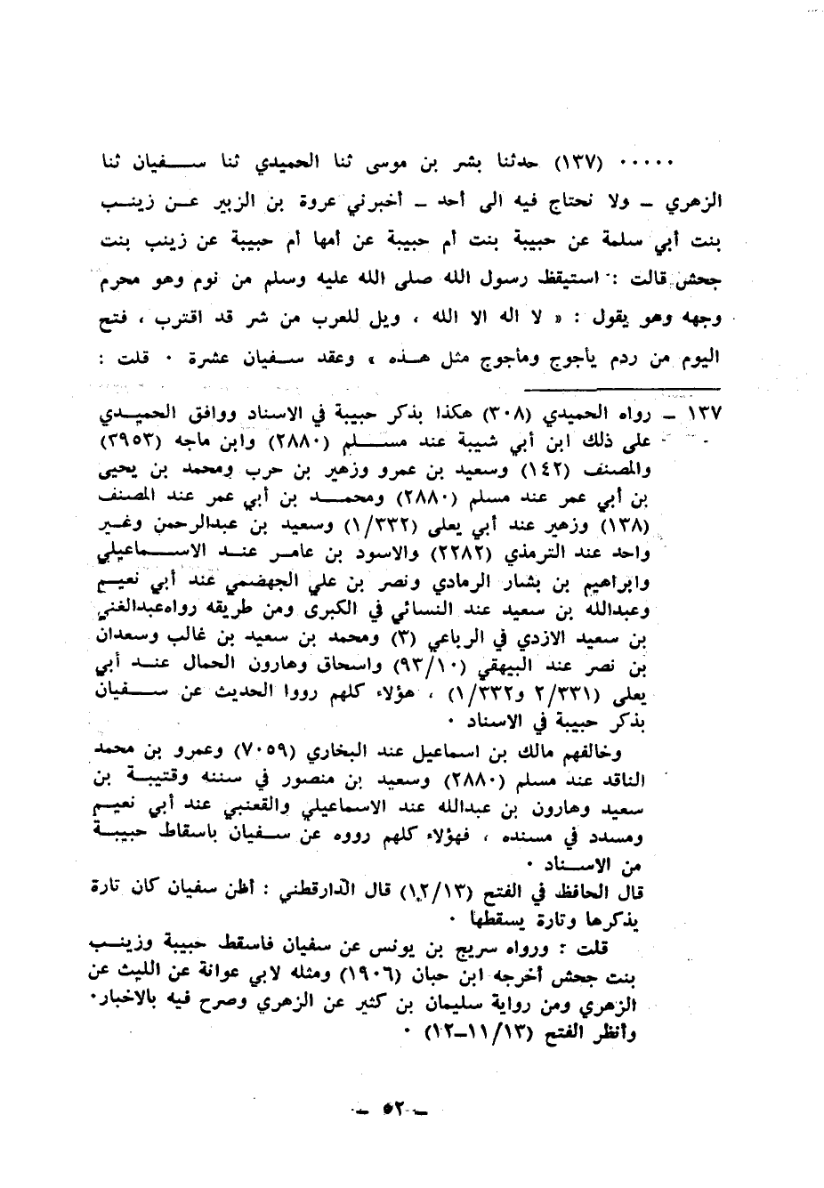 137 - حَدَّثَنَا بِشْرُ بْنُ مُوسَى، ثنا الْحُمَيْدِيُّ، ثنا سُفْيَانُ، ثنا الزُّهْرِيُّ، وَلَا نَحْتاجُ فِيهِ إِلَى أَحَدٍ، أَخْبَرَنِي عُرْوَةُ بْنُ الزُّبَيْرِ، عَنْ زَيْنَبَ بِنْتِ أَبِي سَلَمَةَ، عَنْ حَبِيبَةَ بِنْتِ أُمِّ حَبِيبَةَ، عَنْ أُمِّهَا أُمِّ حَبِيبَةَ، عَنْ زَيْنَبَ بِنْتِ جَحْشٍ، قَالَتْ: اسْتَيْقَظَ رَسُولُ اللهِ صَلَّى اللهُ عَلَيْهِ وَسَلَّمَ مِنْ نَوْمٍ وَهُوَ مُحْمَرٌ وَجْهُهُ، وَهُوَ يَقُولُ: «لَا إِلَهَ إِلَّا اللهُ، §وَيْلٌ لِلْعَرَبِ، مِنْ شَرٍّ قَدِ اقْتَرَبَ، فُتِحَ الْيَوْمَ مِنْ رَدْمِ يَأْجُوجَ وَمَأْجُوجَ مِثْلُ هَذِهِ» - وَعَقَدَ سُفْيَانُ عَشَرَةً - قُلْتُ: يَا رَسُولَ اللهِ أَنَهْلِكُ وَفِينَا الصَّالِحُونَ؟ قَالَ: «نَعَمْ إِذَا كَثُرَ الْخَبَثُ» قَالَ سُفْيَانُ: " أَحْفَظُ فِي هَذَا الْحَدِيثِ أَرْبَعَ نِسْوَةٍ مِنَ الزُّهْرِيِّ، وَقَدْ رَأَيْنَ النَّبِيَّ صَلَّى اللهُ عَلَيْهِ وَسَلَّمَ ثِنْتَيْنِ مِنْ أَزْوَاجِهِ أُمَّ حَبِيبَةَ وَزَيْنَبَ، وَثِنْتَيْنِ مِنْ رَبِيبَتَيْهِ: زَيْنَبَ بِنْتِ أُمِّ سَلَمَةَ، وَحَبِيبَةَ بِنْتِ أُمِّ حَبِيبَةَ، أَبُوهَا عُبَيْدُ اللهِ بْنُ جَحْشٍ مَاتَ بِأَرْضِ الْحَبَشَةِ "