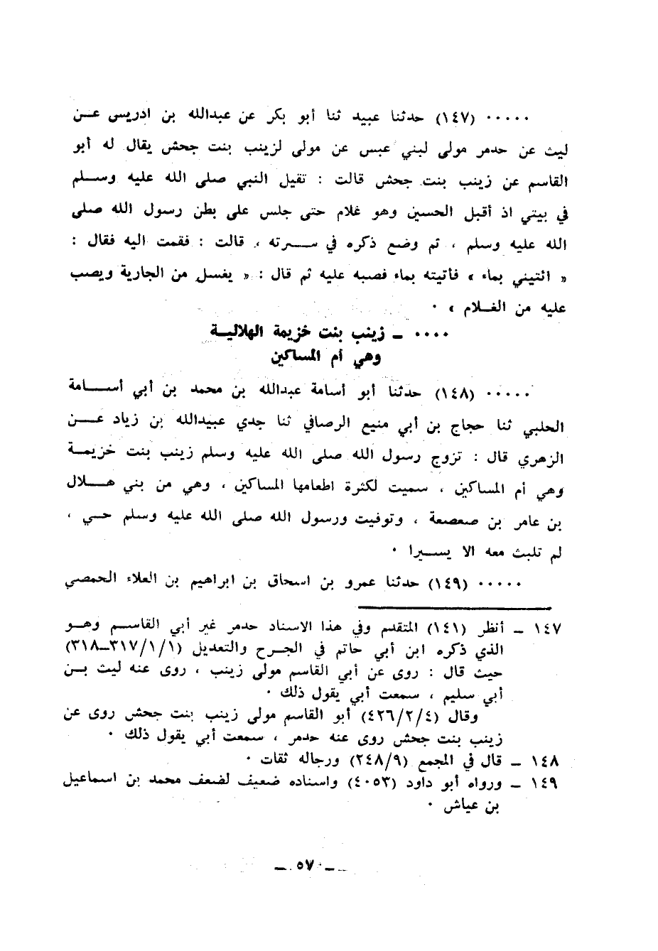 148 - حَدَّثَنَا أَبُو أُسَامَةَ عَبْدُ اللهِ بْنُ مُحَمَّدِ بْنِ أَبِي أُسَامَةَ الْحَلَبِيُّ، ثنا حَجَّاجُ بْنُ أَبِي مَنِيعٍ الرُّصَافِيُّ، ثنا جَدِّي عُبَيْدُ اللهِ بْنُ زِيَادٍ، عَنِ الزُّهْرِيِّ، قَالَ: «§تَزَوَّجَ رَسُولُ اللهِ صَلَّى اللهُ عَلَيْهِ وَسَلَّمَ زَيْنَبَ بِنْتَ خُزَيْمَةَ، وَهِيَ أُمُّ الْمَسَاكِينِ، سُمِّيَتْ لِكَثْرَةِ إِطْعَامِهَا الْمَسَاكِينَ، وَهِيَ مِنْ بَنِي هِلَالِ بْنِ عَامِرِ بْنِ صَعْصَعَةَ، وَتُوُفِّيَتْ وَرَسُولُ اللهِ صَلَّى اللهُ عَلَيْهِ وَسَلَّمَ حَيٌّ لَمْ تَلْبَثْ مَعَهُ إِلَّا يَسِيرًا»