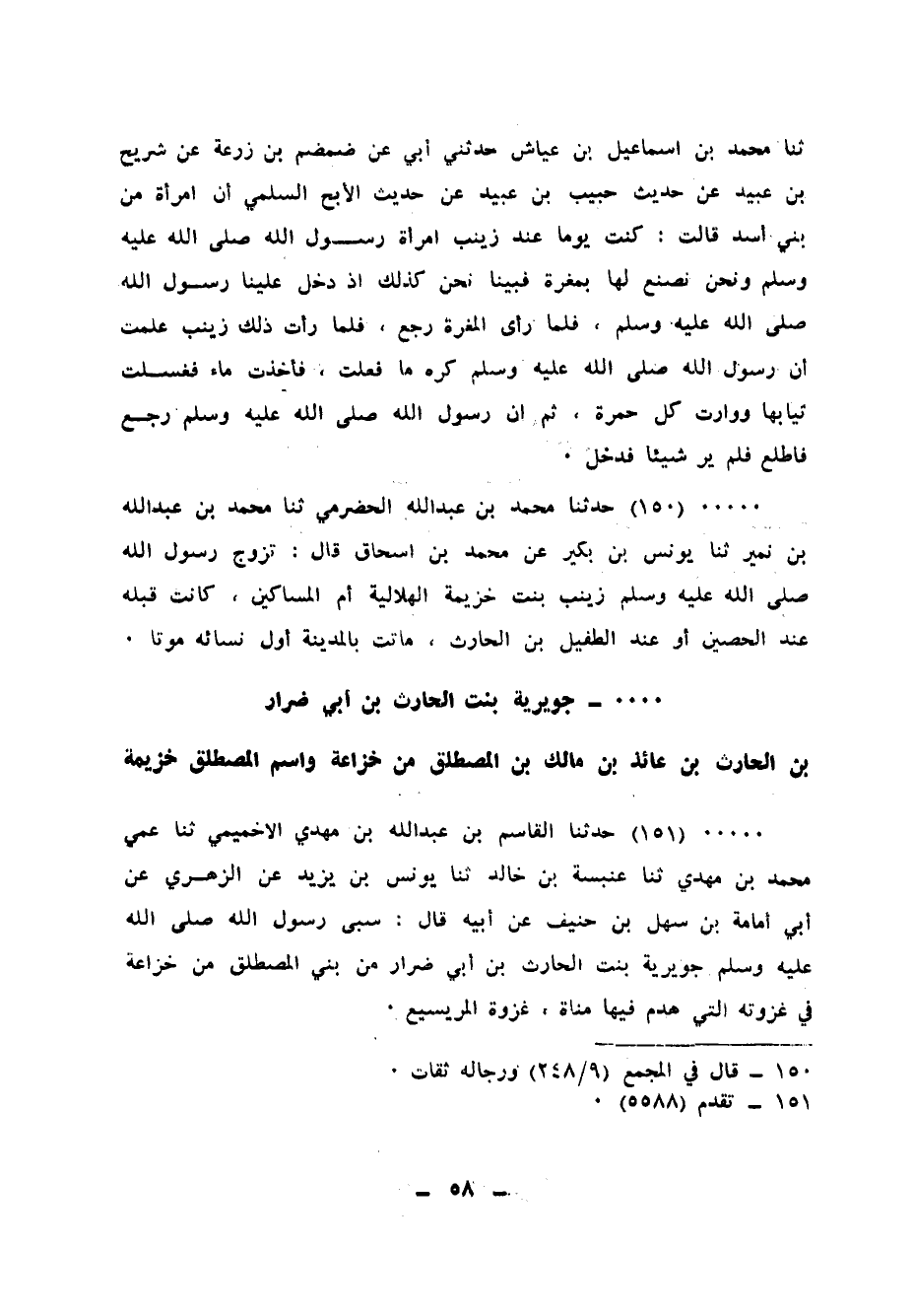 150 - حَدَّثَنَا مُحَمَّدُ بْنُ عَبْدِ اللهِ الْحَضْرَمِيُّ، ثنا مُحَمَّدُ بْنُ عَبْدِ اللهِ بْنِ نُمَيْرٍ، ثنا يُونُسُ بْنُ بُكَيْرٍ، عَنْ مُحَمَّدِ بْنِ إِسْحَاقَ، قَالَ: «§تَزَوَّجَ رَسُولُ اللهِ صَلَّى اللهُ عَلَيْهِ وَسَلَّمَ زَيْنَبَ بِنْتَ خُزَيْمَةَ الْهِلَالِيَّةَ أُمَّ الْمَسَاكِينِ، كَانَتْ قَبْلَهُ عِنْدَ الْحُصَيْنِ، أَوْ عِنْدَ الطُّفَيْلِ بْنِ الْحَارِثِ، مَاتَتْ بِالْمَدِينَةِ أَوَّلُ نِسَائِهِ مَوْتًا»