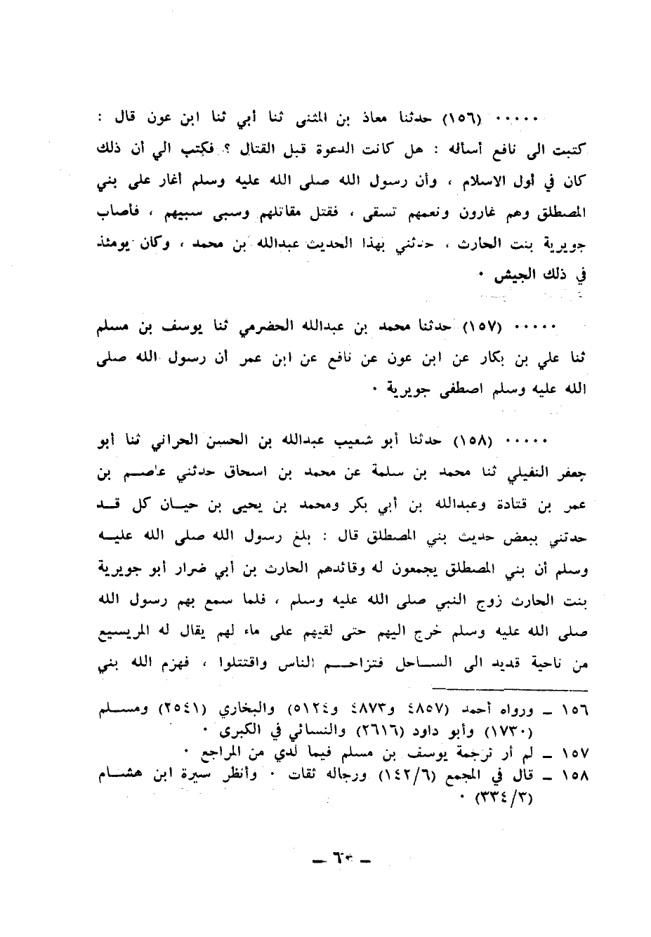156 - حَدَّثَنَا مُعَاذُ بْنُ الْمُثَنَّى، ثنا أَبِي، ثنا ابْنُ عَوْنٍ، قَالَ: كَتَبْتُ إِلَى نَافِعٍ أَسْأَلُهُ: هَلْ كَانَتِ الدَّعْوَةُ قَبْلَ الْقِتَالِ؟ فَكَتَبَ إِلَيَّ أَنَّ ذَلِكَ كَانَ فِي أَوَّلِ الْإِسْلَامِ، «وَأَنَّ رَسُولَ اللهِ صَلَّى اللهُ عَلَيْهِ وَسَلَّمَ §أَغَارَ عَلَى بَنِي الْمُصْطَلِقِ وَهُمْ غَارُونَ، وَنَعَمِهِمْ تُسْقَى فَقَتَلَ مُقَاتِلَهُمْ، وَسَبَى سَبْيَهُمْ فَأَصَابَ جُوَيْرِيَةَ بِنْتَ الْحَارِثِ» حَدَّثَنِي بِهَذَا الْحَدِيثِ عَبْدُ اللهِ بْنُ مُحَمَّدٍ وَكَانَ يَوْمَئِذٍ فِي ذَلِكَ الْجَيْشِ