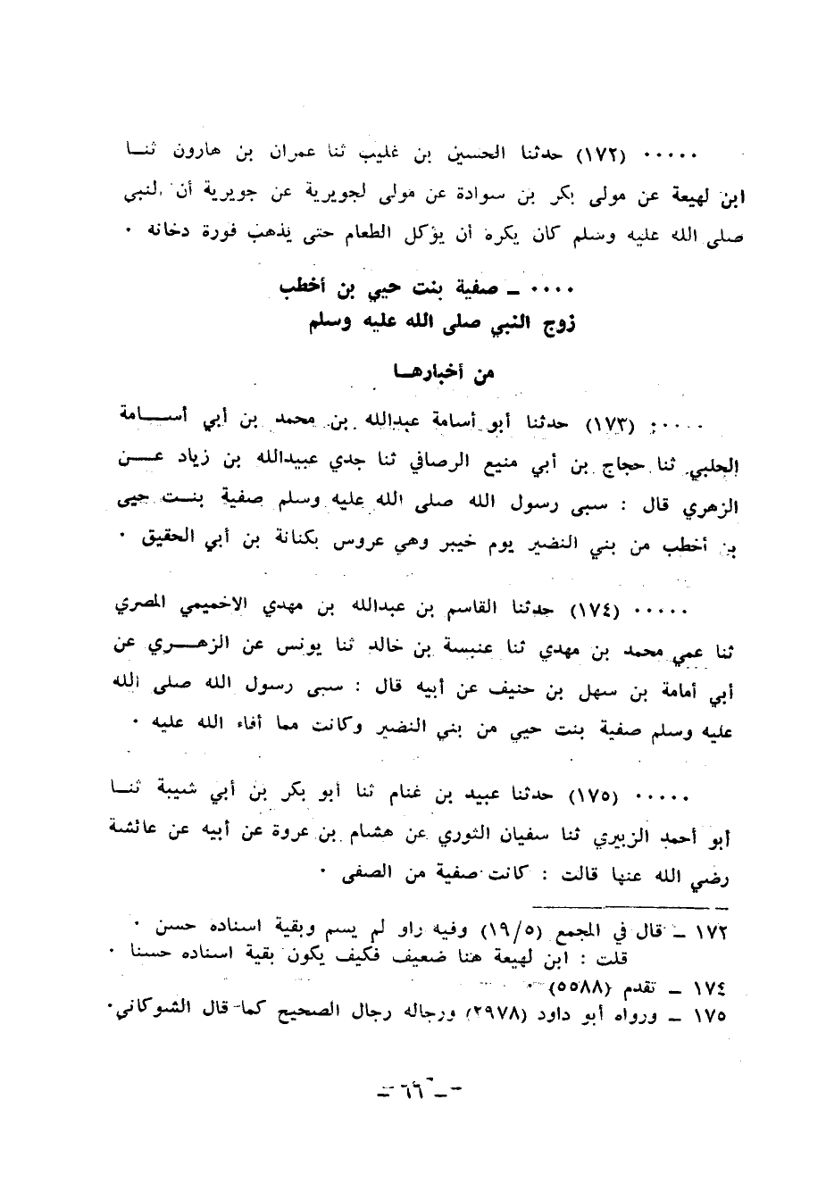 173 - حَدَّثَنَا أَبُو أُسَامَةَ عَبْدُ اللهِ بْنُ مُحَمَّدِ بْنِ أَبِي أُسَامَةَ الْحَلَبِيُّ، ثنا حَجَّاجُ بْنُ أَبِي مَنِيعٍ الرُّصَافِيُّ، ثنا جَدِّي عُبَيْدُ اللهِ بْنُ زِيَادٍ، عَنِ الزُّهْرِيِّ، قَالَ: «§سَبَى رَسُولُ اللهِ صَلَّى اللهُ عَلَيْهِ وَسَلَّمَ صَفِيَّةَ بِنْتَ حُيَيِّ بْنِ أَخْطَبَ مِنْ بَنِي النَّضِيرِ يَوْمَ خَيْبَرَ وَهِيَ عَرُوسٌ بِكِنَانَةِ بْنِ أَبِي الْحُقَيْقِ»