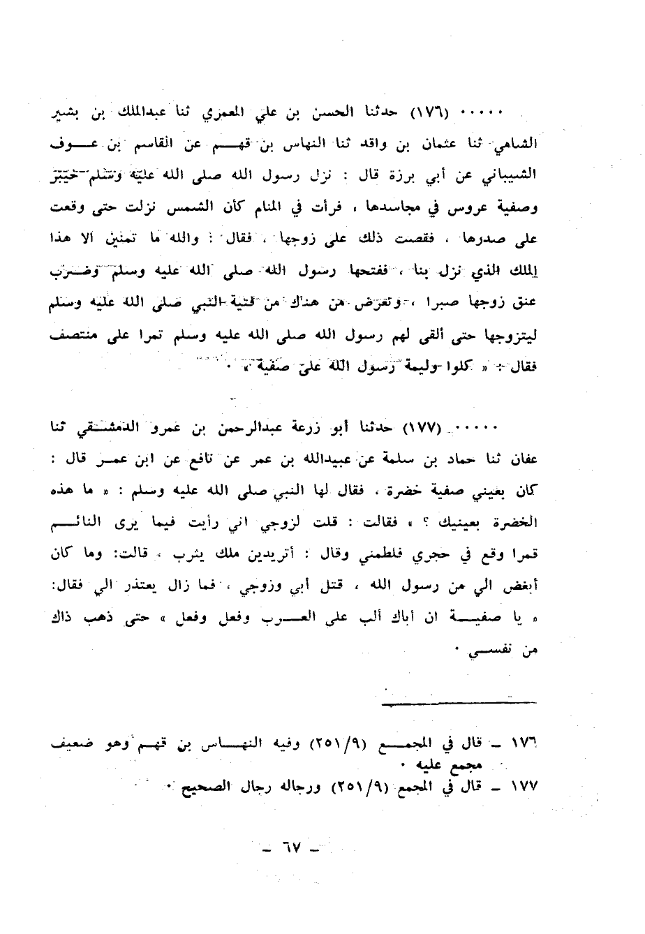 177 - حَدَّثَنَا أَبُو زُرْعَةَ عَبْدُ الرَّحْمَنِ بْنُ عَمْرٍو الدِّمَشْقِيُّ، ثنا عَفَّانُ، ثنا حَمَّادُ بْنُ سَلَمَةَ، عَنْ عُبَيْدِ اللهِ بْنِ عُمَرَ، عَنْ نَافِعٍ، عَنِ ابْنِ عُمَرَ، قَالَ: كَانَ بِعَيْنَيْ صَفِيَّةَ خُضْرَةٌ، فَقَالَ لَهَا النَّبِيُّ صَلَّى اللهُ عَلَيْهِ وَسَلَّمَ: «مَا هَذِهِ الْخُضْرَةُ بِعَيْنَيْكِ؟» فَقَالَتْ: قُلْتُ لِزَوْجِي: إِنِّي رَأَيْتُ فِيمَا يَرَى النَّائِمِ قَمَرًا وَقَعَ فِي حِجْرِي فَلَطَمَنِي، وَقَالَ: أَتُرِيدِينَ مَلِكَ يَثْرِبَ؟ قَالَتْ: وَمَا كَانَ أَبْغَضُ إِلَيَّ مِنْ رَسُولِ اللهِ، قَتَلَ أَبِي وَزَوْجِي، فَمَا زَالَ يَعْتَذِرُ إِلَيَّ فَقَالَ: «يَا صَفِيَّةُ إِنَّ §أَبَاكِ أَلَّبَ عَلَى الْعَرَبَ، وَفَعَلَ وَفَعَلَ» حَتَّى ذَهَبَ ذَاكَ مِنْ نَفْسِي