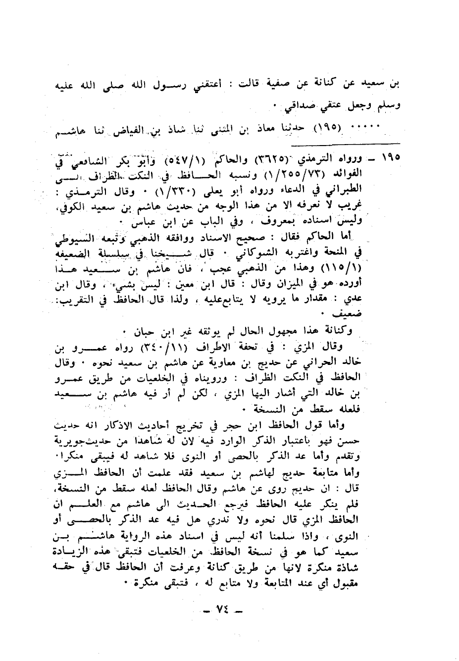195 - حَدَّثَنَا مُعَاذُ بْنُ الْمُثَنَّى، ثنا شَاذُّ بْنُ الْفَيَّاضِ، ثنا هَاشِمُ بْنُ سَعِيدٍ، عَنْ كِنَانَةَ، عَنْ صَفِيَّةَ، قَالَتْ: دَخَلَ عَلِيَّ رَسُولُ اللهِ صَلَّى اللهُ عَلَيْهِ وَسَلَّمَ، وَبَيْنَ يَدَيَّ أَرْبَعَةُ آلَافِ نَوَاةٍ أُسَبِّحُ بِهِنَّ، فَقَالَ: «يَا ابْنَةَ حُيَيٍّ مَا هَذَا؟» فَقُلْتُ: أُسَبِّحُ بِهِنَّ، فَقَالَ: «قَدْ سَبَّحْتُ مُنْذُ قُمْتُ عَلَى رَأْسِكَ بِأَكْثَرِ مِنْ هَذَا» ، قُلْتُ: فَعَلِّمْنِي يَا رَسُولَ اللهِ، قَالَ: «قُولِي §سُبْحَانَ اللهِ عَدَدَ مَا خَلَقَ مِنْ شَيْءٍ»
