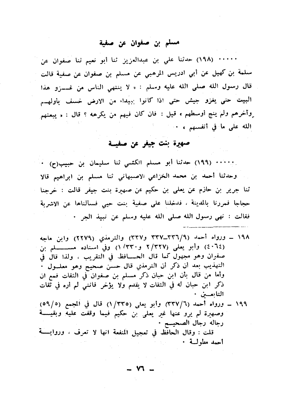 199 - حَدَّثَنَا أَبُو مُسْلِمٍ الْكَشِّيُّ، ثنا سُلَيْمَانُ بْنُ حَبِيبٍ، ح وَحَدَّثَنَا أَحْمَدُ بْنُ مُحَمَّدٍ الْخُزَاعِيُّ الْأَصْبَهَانِيُّ، ثنا مُسْلِمُ بْنُ إِبْرَاهِيمَ، قَالَا: ثنا جَرِيرُ بْنُ حَازِمٍ، عَنْ يَعْلَى بْنِ حَكِيمٍ، عَنْ صُهَيْرَةَ بِنْتِ جَيْفَرٍ، قَالَتْ: خَرَجْنَا حُجَّاجًا فَمَرَرْنَا بِالْمَدِينَةِ، فَدَخَلْنَا عَلَى صَفِيَّةَ بِنْتِ حُيَيٍّ فَسَأَلْنَاهَا عَنِ الْأَشْرِبَةِ، فَقَالَتْ: «§نَهَى رَسُولُ اللهِ صَلَّى اللهُ عَلَيْهِ وَسَلَّمَ عَنْ نَبِيذِ الْجَرِّ» -[77]- انْقَضَى حَدِيثُ أَزْوَاجِ النَّبِيِّ صَلَّى اللهُ عَلَيْهِ وَسَلَّمَ وَرَضِيَ عَنْهُنَّ