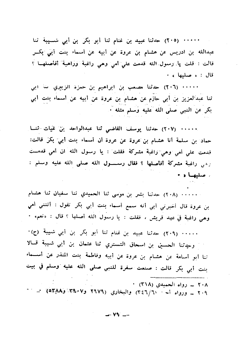 205 - حَدَّثَنَا عُبَيْدُ بْنُ غَنَّامٍ، ثنا أَبُو بَكْرِ بْنِ أَبِي شَيْبَةَ، ثنا عَبْدُ اللهِ بْنُ إِدْرِيسَ، عَنْ هِشَامِ بْنِ عُرْوَةَ، عَنْ أَبِيهِ، عَنْ أَسْمَاءَ بِنْتِ أَبِي بَكْرٍ، قَالَتْ: قُلْتُ: يَا رَسُولَ اللهِ §قَدِمَتْ عَلَيَّ أُمِّي وَهِيَ رَاغِبَةٌ وَرَاهِبَةٌ أَفَأَصِلُهَا؟ قَالَ: «صِلِيهَا»