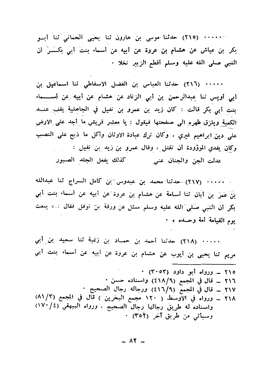 216 - حَدَّثَنَا الْعَبَّاسُ بْنُ الْفَضْلِ الْأَسْفَاطِيُّ، ثنا إِسْمَاعِيلُ بْنُ أَبِي أُوَيْسٍ، ثنا عَبْدُ الرَّحْمَنِ بْنُ أَبِي الزِّنَادِ، عَنْ هِشَامٍ، عَنْ أَبِيهِ، عَنْ أَسْمَاءَ بِنْتِ أَبِي بَكْرٍ، قَالَتْ: " كَانَ §زَيْدُ بْنُ عَمْرِو بْنِ نُفَيْلٍ فِي الْجَاهِلِيَّةِ يَقِفُ عِنْدَ الْكَعْبَةِ، ويُلْزِقُ ظَهْرَهُ إِلَى صَفْحَتِهَا، فَيَقُولُ: يَا مَعْشَرَ قُرَيْشٍ، مَا أَجِدُ عَلَى الْأَرْضِ عَلَى دِينِ إِبْرَاهِيمَ غَيْرِي، وَكَانَ تَرَكَ عِبَادَةَ الْأَوْثَانِ، وَأَكْلِ مَا ذُبِحَ عَلَى النُّصُبِ، وَكَانَ يُفَدِّي الْمَوْؤُودَةَ أَنْ تُقْتَلَ، وَقَالَ عَمْرُو بْنُ زَيْدِ بْنِ نُفَيْلٍ: