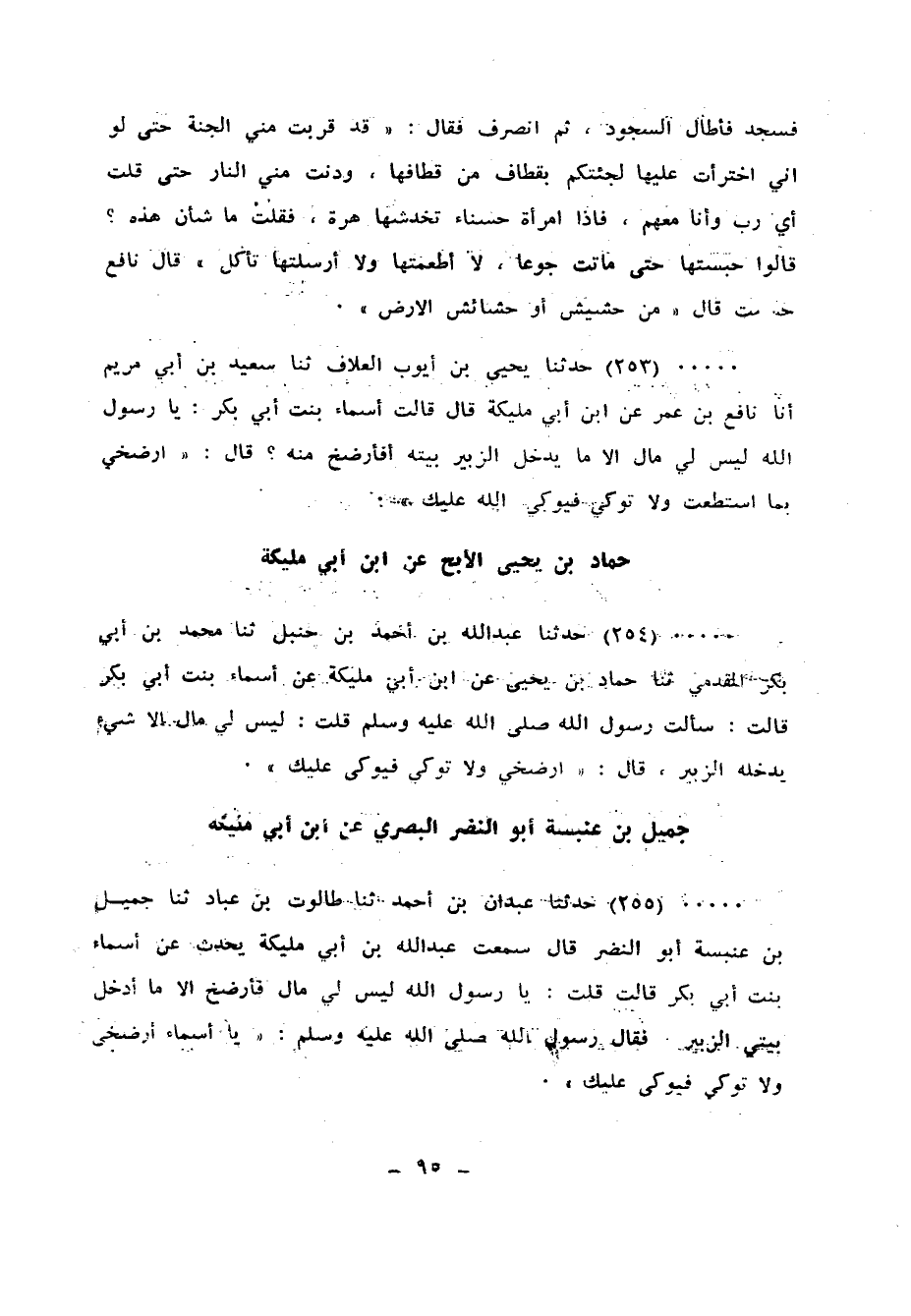254 - حَدَّثَنَا عَبْدُ اللهِ بْنُ أَحْمَدَ بْنِ حَنْبَلٍ، ثنا مُحَمَّدُ بْنُ أَبِي بَكْرٍ الْمُقَدَّمِيُّ، ثنا حَمَّادُ بْنُ يَحْيَى، عَنِ ابْنِ أَبِي مُلَيْكَةَ، عَنْ أَسْمَاءَ بِنْتِ أَبِي بَكْرٍ، قَالَتْ: سَأَلْتُ رَسُولَ اللهِ صَلَّى اللهُ عَلَيْهِ وَسَلَّمَ قُلْتِ: لَيْسَ لِي مَالٌ إِلَّا شَيْءٌ يُدْخِلُهُ الزُّبَيْرُ قَالَ: «§ارْضَخِي وَلَا تُوكِي فَيُوكَى عَلَيْكِ»