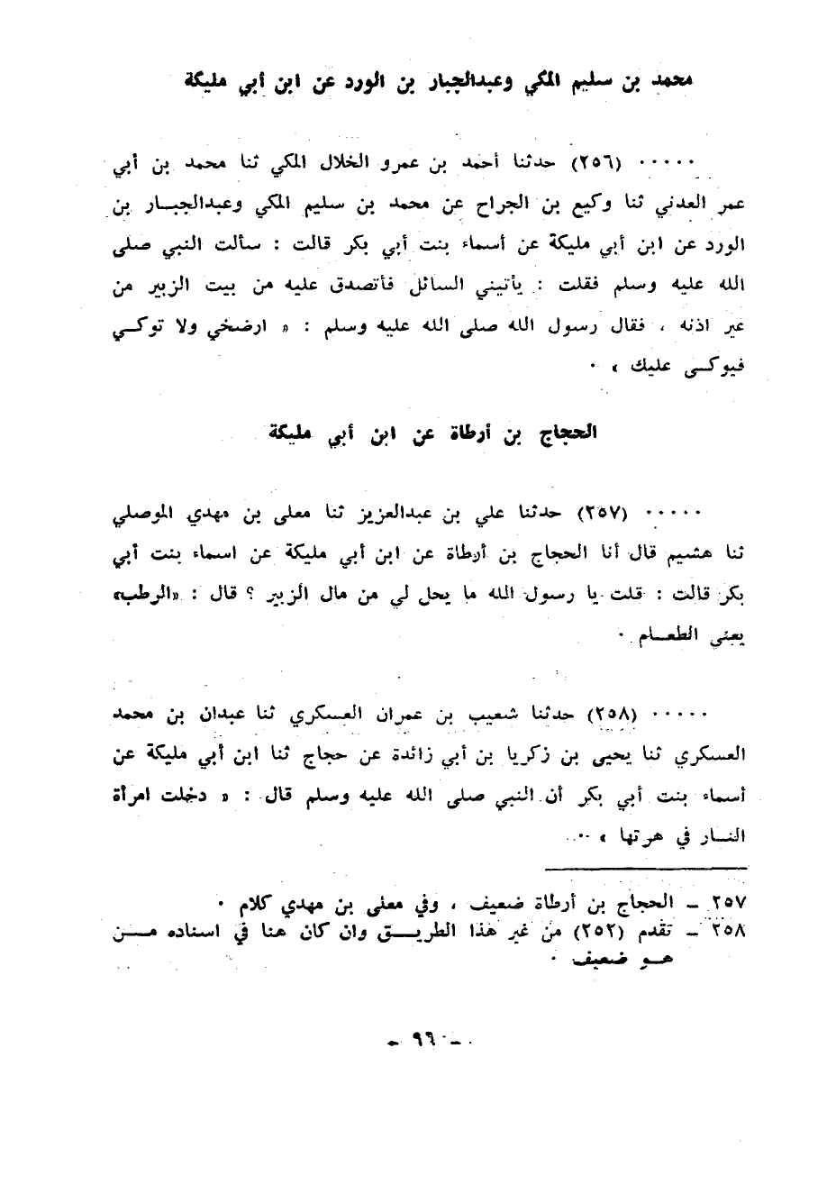 257 - حَدَّثَنَا عَلِيُّ بْنُ عَبْدِ الْعَزِيزِ، ثنا مُعَلَّى بْنُ مَهْدِيٍّ الْمَوْصِلِيُّ، ثنا هُشَيْمٌ، قَالَ: أَنَا الْحَجَّاجُ بْنُ أَرْطَاةَ، عَنِ ابْنِ أَبِي مُلَيْكَةَ، عَنْ أَسْمَاءَ بِنْتِ أَبِي بَكْرٍ، قَالَتْ: قُلْتُ يَا رَسُولَ اللهِ، §مَا يَحِلُّ لِي مِنْ مَالِ الزُّبَيْرِ؟ قَالَ: «الرُّطَبُ» يَعْنِي الطَّعَامَ