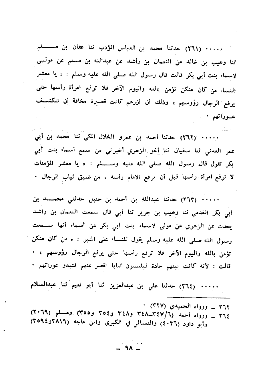 263 - حَدَّثَنَا عَبْدُ اللهِ بْنُ أَحْمَدَ بْنِ حَنْبَلٍ، حَدَّثَنِي مُحَمَّدُ بْنُ أَبِي بَكْرٍ الْمُقَدَّمِيُّ، ثنا وَهْبُ بْنُ جَرِيرٍ، ثنا أَبِي، قَالَ: سَمِعْتُ النُّعْمَانَ بْنَ رَاشِدٍ يُحَدِّثُ، عَنِ الزُّهْرِيِّ، عَنْ مَوْلًى لِأَسْمَاءَ بِنْتِ أَبِي بَكْرٍ، عَنْ أَسْمَاءَ، أَنَّهَا سَمِعَتْ رَسُولَ اللهِ صَلَّى اللهُ عَلَيْهِ وَسَلَّمَ يَقُولُ لِلنِّسَاءِ عَلَى الْمِنْبَرِ: «§مَنْ كَانَتْ مِنْكُنَّ تُؤْمِنُ بِاللهِ وَالْيَوْمِ الْآخِرِ فَلَا تَرْفَعْ رَأْسَهَا حَتَّى يَرْفَعَ الرِّجَالُ رُءُوسَهُمْ» قَالَتْ: «لِأَنَّهُ كَانَتْ بَيْنَهُمْ حَادَّةٌ فَيَلْبَسُونَ ثِيَابًا تَقْصُرُ عَنْهُمْ فَتَبْدُو عَوْرَاتُهُمْ»