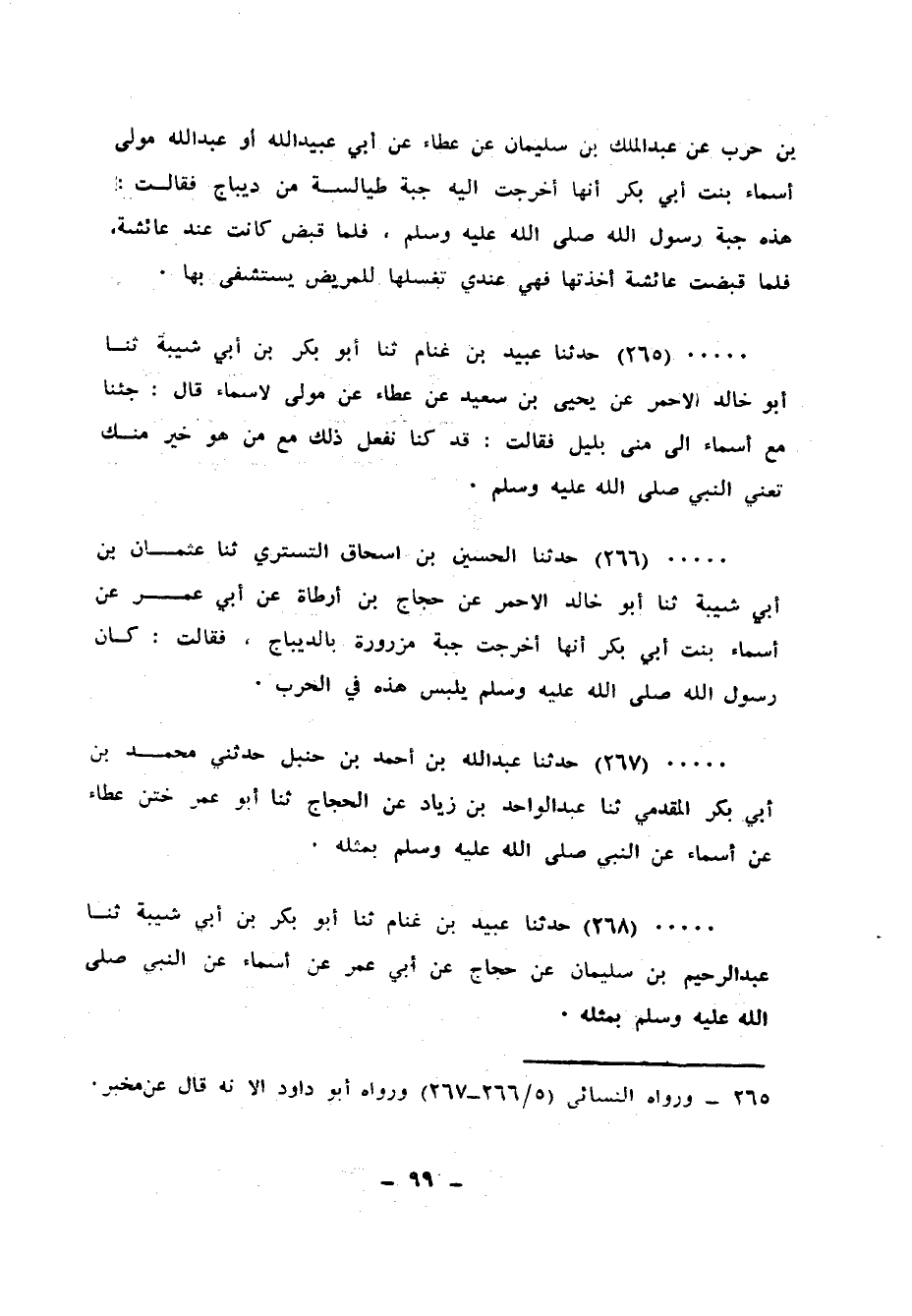 266 - حَدَّثَنَا الْحُسَيْنُ بْنُ إِسْحَاقَ التُّسْتَرِيُّ، ثنا عُثْمَانُ بْنُ أَبِي شَيْبَةَ، ثنا أَبُو خَالِدٍ الْأَحْمَرُ، عَنْ حَجَّاجِ بْنِ أَرْطَاةَ، عَنْ أَبِي عُمَرَ، عَنْ أَسْمَاءَ بِنْتِ أَبِي بَكْرٍ، أَنَّهَا أَخْرَجَتْ جُبَّةً مَزْرُورَةً بِالدِّيبَاجِ، فَقَالَتْ: «كَانَ رَسُولُ اللهِ صَلَّى اللهُ عَلَيْهِ وَسَلَّمَ §يَلْبَسُ هَذِهِ فِي الْحَرْبِ»