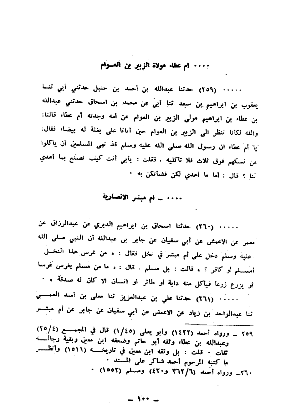 259 - حَدَّثَنَا عَبْدُ اللهِ بْنُ أَحْمَدَ بْنِ حَنْبَلٍ، حَدَّثَنِي أَبِي، ثنا يَعْقُوبُ بْنُ إِبْرَاهِيمَ بْنِ سَعْدٍ، ثنا أَبِي، عَنْ مُحَمَّدِ بْنِ إِسْحَاقَ، حَدَّثَنِي عَبْدُ اللهِ بْنُ عَطَاءِ بْنِ إِبْرَاهِيمَ، مَوْلَى الزُّبَيْرِ بْنِ الْعَوَّامِ عَنْ أُمِّهِ وَجَدَّتَهِ أُمِّ عَطَاءٍ، قَالَتَا: وَاللهِ لَكُنَّا نَنْظُرُ إِلَى الزُّبَيْرِ بْنِ الْعَوَّامِ حِينَ أَتَانَا عَلَى بَغْلَةٍ لَهُ بَيْضَاءَ، فَقَالَ: يَا أُمَّ عَطَاءٍ: إِنَّ رَسُولَ اللهِ صَلَّى اللهُ عَلَيْهِ وَسَلَّمَ قَدْ: " §نَهَى الْمُسْلِمِينَ أَنْ يَأْكُلُوا مِنْ نُسُكِهِمْ فَوْقَ ثَلَاثٍ فَلَا تَأْكُلِيهِ، فَقُلْتُ بِأَبِي أَنْتَ كَيْفَ نَصْنَعُ بِمَا أُهْدِيَ لَنَا؟ قَالَ: أَمَّا مَا أُهْدِيَ لَكِنْ فَشَأْنُكُنَّ بِهِ "