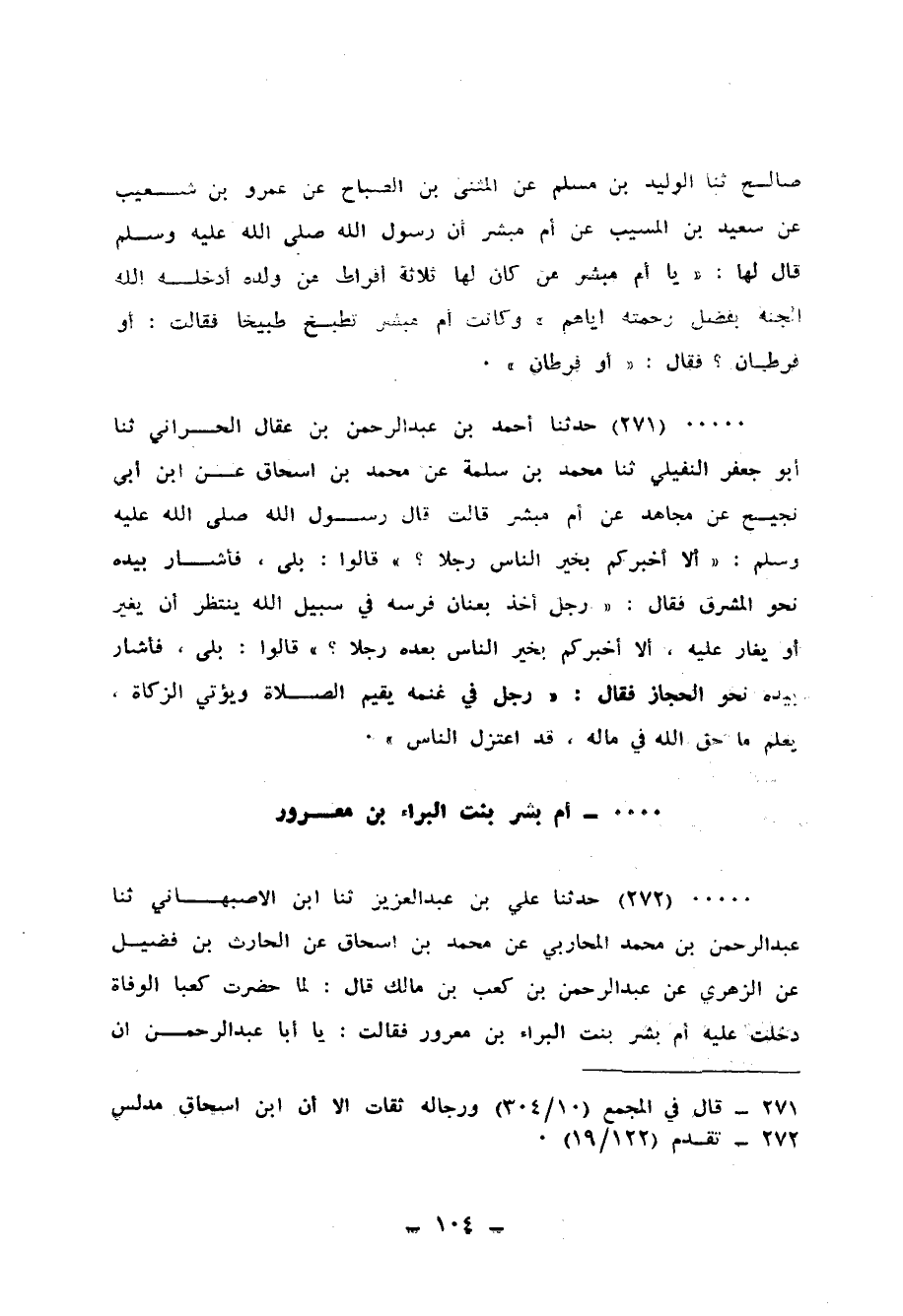 271 - حَدَّثَنَا أَحْمَدُ بْنُ عَبْدِ الرَّحْمَنِ بْنِ عِقَالٍ الْحَرَّانِيُّ، ثنا أَبُو جَعْفَرٍ النُّفَيْلِيُّ، ثنا مُحَمَّدُ بْنُ سَلَمَةَ، عَنْ مُحَمَّدِ بْنِ إِسْحَاقَ، عَنِ ابْنِ أَبِي نَجِيحٍ، عَنْ مُجَاهِدٍ، عَنْ أُمِّ مُبَشِّرٍ، قَالَتْ: قَالَ رَسُولُ اللهِ صَلَّى اللهُ عَلَيْهِ وَسَلَّمَ: «§أَلَا أُخْبِرُكُمْ بَخَيْرِ النَّاسِ رَجُلًا؟» قَالُوا: بَلَى، فَأَشَارَ بِيَدِهِ نَحْوَ الْمَشْرِقِ، فَقَالَ: «رَجُلٌ آخِذٌ بِعَنَانِ فَرَسِهِ فِي سَبِيلِ اللهِ يَنْتَظِرُ أَنْ يُغِيرَ أَوْ يُغَارَ عَلَيْهِ، أَلَا أُخْبِرُكُمْ بِخَيْرِ النَّاسِ بَعْدَهُ رَجُلًا؟» قَالُوا: بَلَى فَأَشَارَ بِيَدِهِ نَحْوَ الْحِجَازِ، فَقَالَ: «رَجٌلٌ فِي غَنَمِهِ يُقِيمُ الصَّلَاةَ وَيُؤْتِي الزَّكَاةَ، يَعْلَمُ مَا حَقُّ اللهِ فِي مَالِهِ، قَدِ اعْتَزَلَ النَّاسَ»