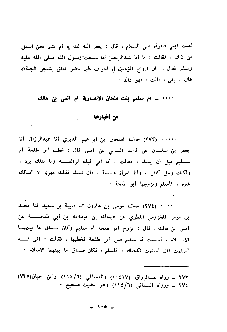 273 - حَدَّثَنَا إِسْحَاقُ بْنُ إِبْرَاهِيمَ الدَّبَرِيُّ، أنا عَبْدُ الرَّزَّاقِ، أَنَا جَعْفَرُ بْنُ سُلَيْمَانَ، عَنْ ثَابِتٍ الْبُنَانِيِّ، عَنْ أَنَسٍ، قَالَ: §خَطَبَ أَبُو طَلْحَةَ أُمَّ سُلَيْمٍ قَبْلَ أَنْ يُسْلِمَ، فَقَالَتْ: «أَمَا إِنِّي فِيكَ لَرَاغِبَةٌ، وَمَا مِثْلُكَ يُرَدُّ، وَلَكِنَّكَ رَجُلٌ كَافِرٌ وَأَنَا امْرأَةٌ مُسْلِمَةٌ، فِإِنْ تُسْلِمْ فَذَلِكَ مَهْرِي لَا أَسْأَلُكَ غَيْرَهُ» ، وَتَزَوَّجَهَا أَبُو طَلْحَةَ