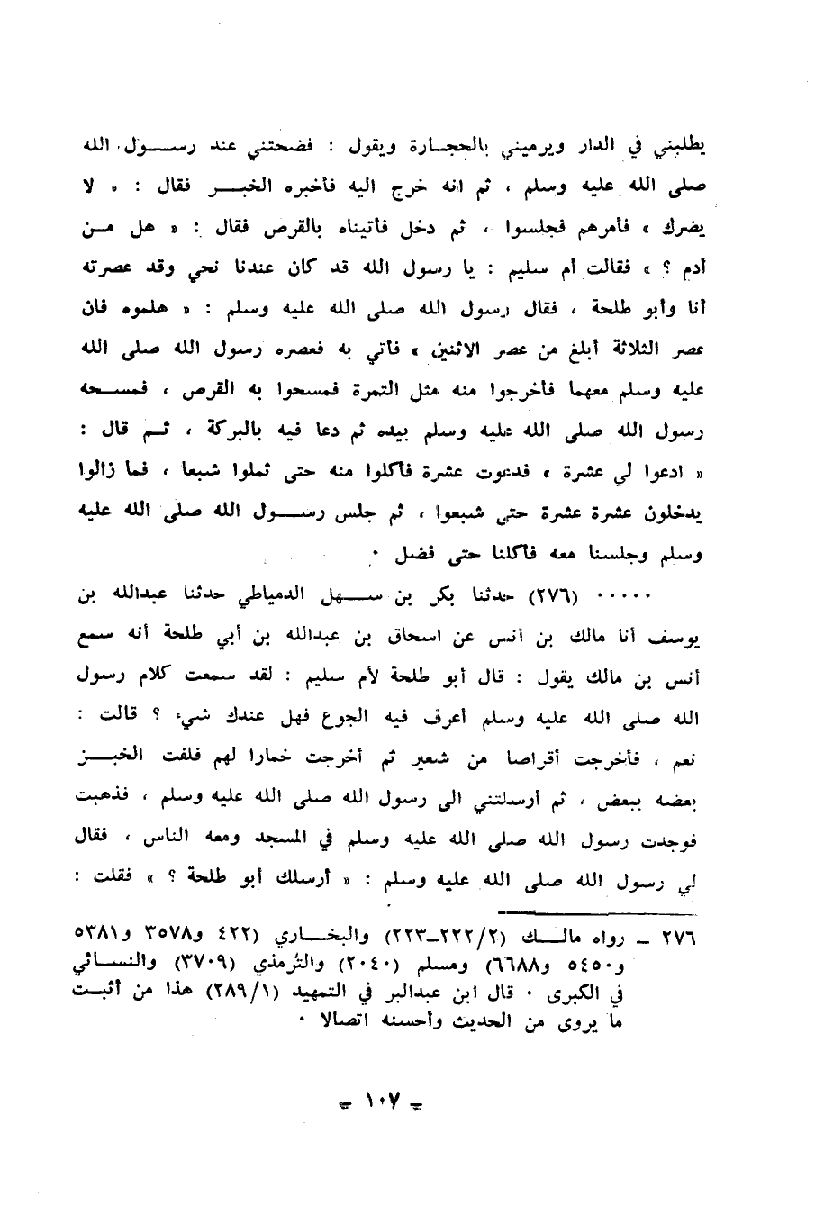 276 - حَدَّثَنَا بَكْرُ بْنُ سَهْلٍ الدِّمْيَاطِيُّ، حَدَّثَنَا عَبْدُ اللهِ بُْن يُوسُفَ، أنا مَالِكُ بْنُ أَنَسٍ، عَنْ إِسْحَاقَ بْنِ عَبْدِ اللهِ بْنِ أَبِي طَلْحَةَ، أَنَّهُ سَمِعَ أَنَسَ بْنَ مَالِكٍ، يَقُولُ: قَالَ أَبُو طَلْحَةَ لِأُمِّ سُلَيْمٍ: لَقَدْ سَمِعْتُ كَلَامَ رَسُولِ اللهِ صَلَّى اللهُ عَلَيْهِ وَسَلَّمَ أَعْرِفُ فِيهِ الْجُوعَ، فَهَلْ عِنْدَكِ شَْيءٌ؟ قَالَتْ: نَعَمْ، فَأَخْرَجَتْ أَقْرَاصًا مِنْ شَعِيرٍ، ثُمَّ أَخْرَجَتْ خِمَارًا لَهُمْ فَلَفَّتِ الْخُبْزَ بَعْضَهَ بِبَعْضٍ، ثُمَّ أَرْسَلَتْنِي إِلَى رَسُولِ اللهِ صَلَّى اللهُ عَلَيْهِ وَسَلَّمَ، فَذَهَبْتُ فَوَجَدْتُ رَسُولَ اللهِ صَلَّى اللهُ عَلَيْهِ وَسَلَّمَ فِي الْمَسْجِدِ وَمَعَهُ النَّاسُ، فَقَالَ لِي رَسُولُ اللهِ صَلَّى اللهُ عَلَيْهِ وَسَلَّمَ: «أَرْسَلَكَ أَبُو طَلْحَةَ؟» فَقُلْتُ: نَعَمْ، فَقَالَ رَسُولُ اللهِ صَلَّى اللهُ عَلَيْهِ وَسَلَّمَ لِمَنْ مَعَهُ: «قُومُوا» فَانْطَلَقَ وَانْطَلَقْتُ بَيْنَ أَيدِيهِمْ حَتَّى جِْئتُ أَبَا طَلْحَةَ فَأَخْبَرْتُهُ، فَقَالَ أَبُو طَلْحَةَ: يَا أُمَّ سُلَيْمٍ، قَدْ جَاءَ رَسُولُ اللهِ صَلَّى اللهُ عَلَيْهِ وَسَلَّمَ بِالنَّاِس، وَلَيْسَ عِنْدَنَا مِنَ الطَّعَامِ مَا يُشْبِعُهُمْ، قَالَتْ: اللهُ وَرَسُولُهُ أَعْلَمُ، فَانْطَلَقَ أَبُو طَلْحَةَ حَتَّى بَلَغْنَا رَسُولَ اللهِ صَلَّى اللهُ عَلَيْهِ وَسَلَّمَ، فَأَقْبَلَ رَسُولُ اللهِ وَأَبُو طَلْحَةَ مَعَهُ حَتَّى دَخَلَا، فَقَالَ رَسُولُ اللهِ صَلَّى اللهُ عَلَيْهِ وَسَلَّمَ: «§هَلُمِّي يَا أُمَّ سُلَيْمٍ مَا عِنْدَكِ» فَأَتَتْ بِذَلِكَ الْخُبْزِ فَأَمَرَ بِهِ رَسُولُ اللهِ صَلَّى اللهُ عَلَيْهِ وَسَلَّمَ فَفُتَّ، وَعَصَرَتْ أُمُّ سُلَيْمٍ عُكَّةً فَآدَمَتْهُ ثُمَّ قَالَ رَسُولُ اللهِ صَلَّى اللهُ عَلَيْهِ وَسَلَّمَ فِيهِ مَا شَاءَ اللهُ أَنْ يَقُولَ، ثُمَّ قَالَ: «ائْذَنْ لِعَشْرَةٍ» فَأَذِنَ لَهُمْ فَأَكَلُوا حَتَّى شَبِعُوا ثُمَّ خَرَجُوا، ثُمَّ قَالَ: «ائْذَنْ لِعَشْرَةٍ» فَأَذِنَ لَهُمْ فَأَكَلُوا حَتَّى شَبِعُوا، ثُمَّ خَرَجُوا ثُمَّ قَالَ: «ائْذَنْ لِعَشْرَةٍ» فَأَذِنَ لَهُمْ فَأَكَلُوا حَتَّى شَبِعُوا ثُمَّ خَرَجُوا، ثُمَّ قَالَ: «ائْذَنْ لِعَشْرَةٍ» فَأَذِنَ لَهُمْ فَأَكَلُوا حَتَّى شَبِعُوا، ثُمَّ خَرَجُوا، ثَمَّ قَالَ: «ائْذَنْ لِعَشْرَةٍ» فَأَكَلَ الْقَوْمُ كُلُّهُمْ حَتَّى شَبِعُوا وَالْقَوْمُ سَبْعُونُ أَوْ ثَمَانُونَ