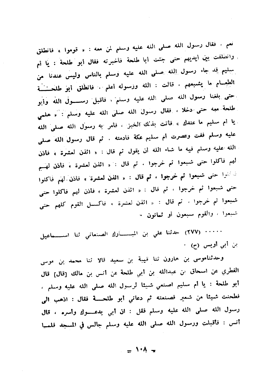277 - حَدَّثَنَا عَلِيُّ بْنُ الْمُبَارَكِ الصَّنْعَانِيُّ، ثنا إِسْمَاعِيلُ بْنُ أَبي أُوَيْسٍ، ح وَحَدَّثَنَا مُوسَى بْنُ هَارُونَ، ثنا قُتَيْبَةُ بْنُ سَعِيدٍ، قَالَا: ثنا مُحَمَّدُ بْنُ مُوسَى الْفِطْرِيُّ، عَنْ إِسْحَاقَ بْنِ عَبْدِ اللهِ بْنِ أَبِي طَلْحَةَ، عَنْ أَنَسِ بْنِ مَالِكٍ، قَالَ: قَالَ أَبُو طَلْحَةَ: " يَا أُمَّ سُلَيْمٍ، اصْنَعِي شَيْئًا لِرَسُولِ اللهِ صَلَّى اللهُ عَلَيْهِ وَسَلَّمَ، فَطَحَنَتْ شَيْئًا مِنْ شَعِيرٍ فَصَنَعَتْهُ، ثُمَّ دَعَانِي أَبُو طَلْحَةَ، فَقَالَ: اذْهَبْ إِلَى رَسُولِ اللهِ صَلَّى اللهُ عَلَيْهِ وَسَلَّمَ فَقُلْ: إِنَّ أَبِي يَدْعُوكَ، وَأَسِرَّهُ، قَالَ أَنَسٌ: فَأَقْبَلْتُ وَرَسُولُ اللهِ صَلَّى اللهُ عَلَيْهِ وَسَلَّمَ جَالِسٌ فِي الْمَسْجِدِ، فَلَمَّا رَآنِي قَالَ: «يَا أَنَسُ» قُلْتُ: لَبَّيْكَ يَا رَسُولَ اللهِ، قَالَ: «دَعَانِي أَبُوكَ؟» قُلْتُ: نَعَمْ، قَالَ: «قُومُوا» ثُمَّ قَالَ: لَمْ يَمُرَّ رَسُولُ اللهِ صَلَّى اللهُ عَلَيْهِ وَسَلَّمَ عَلَى مَجْلِسٍ إِلَّا قَالَ: «قُومُوا» فَخَرَجْتُ سَرِيعًا حَتَّى أَتَيْتُ أَبَا طَلْحَةَ فَقُلْتُ: هَذَا رَسُولُ اللهِ صَلَّى اللهُ عَلَيْهِ وَسَلَّمَ قَدْ جَاءَ وَأَتَى بِالنَّاسِ، فَقَالَ أَبُو طَلْحَةَ: أَلَمْ آمُرْكَ أَنْ تَخْلُوَ بِهِ؟ قُلْتُ: لَمَّا سَأَلَنِي هَلْ دَعَانِي أَبُوكَ؟ فَقُلْتُ: نَعَمْ لَمْ أَكْذِبْهُ، وَلَقِيَ أَبُو طَلْحَةَ رَسُولَ اللهِ صَلَّى اللهُ عَلَيْهِ وَسَلَّمَ عَلَى بَابِ الدَّارِ فَقَالَ: يَا رَسُولَ اللِّهِ، إِنَّمَا هُوَ شَيْءٌ أَرَدْنَا أَنْ نَخُصَّكَ بِهِ فَقَالَ: «ادْخُلْ» فَدَخَلَ هُوَ وَرَسُولُ اللهِ صَلَّى اللهُ عَلَيْهِ وَسَلَّمَ، قَالَ: وَأُمُّ سُلَيْمٌ مَعَهَا عُكَّةٌ تَعْصُرُهَا وَكَانَتْ يَبِسَتْ أَوْ كَادَتْ تَيْبَسُ، فَقَالَ رَسُولُ اللهِ صَلَّى اللهُ عَلَيْهِ وَسَلَّمَ: «يَا أُمَّ سُلَيْمٍ نَاوِلِنِيهَا حَتَّى أَكُونَ أَحْسَنَ لَهَا عَصْرًا مِنْكِ» فَأَخَذَ رَسُولُ اللهِ صَلَّى اللهُ عَلَيْهِ وَسَلَّمَ بِيَدِهِ فَقَالَ بِالسَّمْنِ هَكَذَا، ثُمَّ وَضَعَ رَسُولُ اللهِ صَلَّى اللهُ عَلَيْهِ وَسَلَّمَ يَدَهُ عَلَى رَأْسِ الثَّرِيدِ، ثُمَّ قَالَ: «يَا أَبَا طَلْحَةَ، §أَدْخِلْ عَشْرَةً» ، فَدَخَلَ عَلَيْهِ عَشْرَةٌ فَأَكَلُوا حَتَّى شَبِعُوا ثُمَّ لَمْ يَزَلْ يُدْخِلُ عَشْرَةً عَشْرَةً فَأَكَلُوا حَتَّى ثَمِلُوا، حَتَّى دَخَلَ عَلَيْهِ مَا بَيْنَ السَّبْعِينَ إِلَّى الثَّمَانِينَ، ثُمَّ أًَكَلَ رَسُولُ اللهِ صَلَّى اللهُ عَلَيْهِ وَسَلَّمَ وَأَهْلُ الْبَيْتِ وَأَفْضَلُوا مَا أَهْدَوْا لِجِيرَانِهِمْ