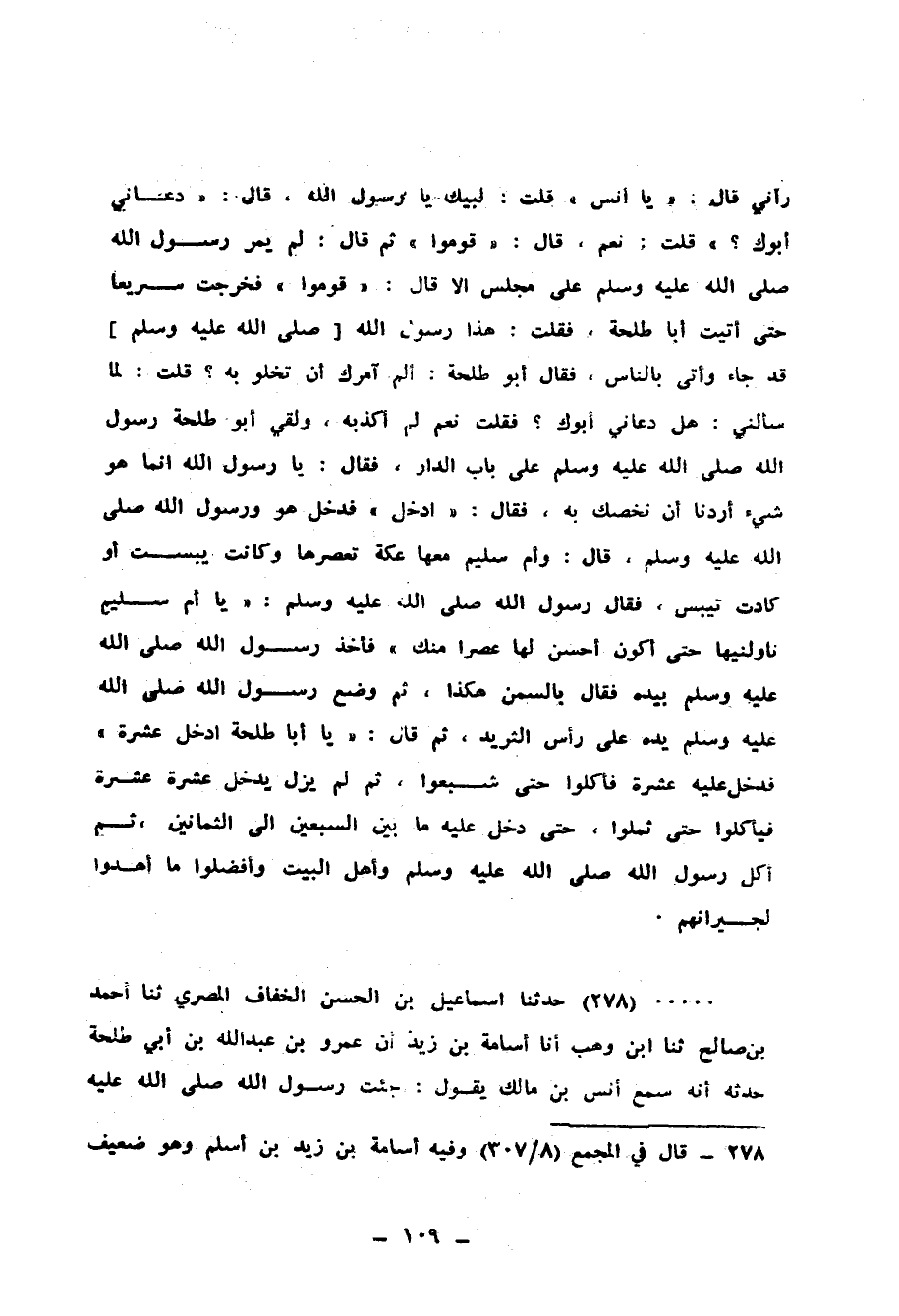 278 - حَدَّثَنَا إِسْمَاعِيلُ بْنُ الْحَسَنِ الْخَفَّافُ الْمِصْرِيُّ، ثنا أَحْمَدُ بْنُ صَالِحٍ، ثنا ابْنُ وَهْبٍ، أنا أُسَامَةُ بْنُ زَيْدٍ، أَنَّ عَمْرَو بْنَ عَبْدِ اللهِ بْنِ أَبِي طَلْحَةَ، حَدَّثَهُ أَنَّهُ، سَمِعَ أَنَسَ بْنَ مَالِكٍ، يَقُولُ: جِئْتُ رَسُولَ اللهِ صَلَّى اللهُ عَلَيْهِ وَسَلَّمَ -[110]- يَوْمًا، فَوَجَدْتُهُ جَالِسًا مَعَ أَصْحَابِهِ يُحَدِّثُهُمْ وَقَدْ عَصَبَ بَطْنَهُ عَلَى حَجَرٍ، فَقُلْتُ لِبَعْضِ أَصْحَابِهِ لِمَ عَصَبَ رَسُولُ اللهِ صَلَّى اللهُ عَلَيْهِ وَسَلَّمَ بَطْنَهُ؟ فَقَالَ: مِنَ الْجُوعِ، فَذَهَبْتُ إِلَى أَبِي طَلْحَةَ وَهُوَ زَوْجُ أُمِّ سُلَيْمٍ بِنْتِ مِلْحَانَ فَقُلْتُ: يَا أَبَتَاهُ قَدْ رَأَيْتُ رَسُولَ اللهِ صَلَّى اللهُ عَلَيْهِ وَسَلَّمَ قَدْ عَصَبَ بَطْنَهُ بِعِصَابَةٍ فَسَأَلْتُ بَعْضَ أَصْحَابِهِ، فَقَالَ: مِنَ الْجُوعِ، فَدَخَلَ أَبُو طَلْحَةَ عَلَى أُمِّي، فَقَالَ: هَلْ مِنْ شَيْءٍ؟ فَقَالَتْ: عِنْدِي كِسَرٌ مِنْ خُبْزٍ وَتَمَرَاتٌ فَإِنْ جَاءَ النَّبِيُّ صَلَّى اللهُ عَلَيْهِ وَسَلَّمَ أَشْبَعْنَاهُ، وَإِنْ جَاءَ مَعَهُ أَحَدٌ قَلَّ عَنْهُمْ، فَقَالَ أَبُو طَلْحَةَ: اذْهَبْ يَا أَنَسُ فَقُمْ قَرِيبًا مِنْ رَسُولِ اللهِ، فَإِذَا قَامَ فَادْعُهُ حَتَّى يَتَفَرَّقَ أَصْحَابُهُ وَمَنْ مَعَهُ حَتَّى إِذَا قَامَ عَلَى عَتَبَةِ بَابِهِ، فَقُلْ: أَبِي يَدْعُوكَ فَفَعَلْتُ ذَلِكَ، فَلَمَّا قُلْتُ أَبِي يَدْعُوكَ قَالَ لِأَصْحَابِهِ: يَا هَؤُلَاءِ تَعَالَوْا ثُمَّ أَخَذَ بِيَدِي فَشَدَّهَا وَأَقْبَلَ بِأَصْحَابِهِ حَتَّى إِذَا دَنَوْا مِنْ بَيْتِنَا أَرْسَلَ يَدِي، فَدَخَلْتُ وَأَنَا حَزِينٌ لِكَثْرَةِ مَنْ جَاءَ مَعَهُ، فَقُلْتُ: يَا أَبَتَاهُ قَدْ قُلْتُ لِرَسُولِ اللهِ الَّذِي قُلْتَ لِي فَدَعَا أَصْحَابَهُ فَقَدْ جَاءَكَ بِهِمْ فَخَرَجَ أَبُو طَلْحَةَ إِلَيْهِمْ، فَقَالَ: يَا رَسُولَ اللهِ إِنَّمَا أَرْسَلْتُ أَنَسًا يَدْعُوكَ وَحْدَكَ وَلَمْ يَكُ عِنْدِي مَا يُشْبِعُ مَنْ أَرَى، فَقَالَ رَسُولُ اللهِ صَلَّى اللهُ عَلَيْهِ وَسَلَّمَ: «§ادْخُلْ فَإِنَّ اللهَ عَزَّ وَجَلَّ سَيُشْبِعُهُمْ بِمَا عِنْدَكَ» ، فَدَخَلَ مَعِي رَسُولُ اللهِ صَلَّى اللهُ عَلَيْهِ وَسَلَّمَ، فَقَالَ: «اجْمَعُوا مَا كَانَ عِنْدَكُمْ، ثُمَّ قَرِّبُوهُ» ، وَجَلَسَ مَنْ كَانَ عِنْدَهُ بِالسُّدَّةِ، وَقَرَّبْتُ مَا كَانَ عِنْدَنَا مِنْ خُبْزٍ وَتَمْرٍ، فَجَعَلْنَاهُ عَلَى حَصِيرِنَا فَدَعَا فِيهِ بِالْبَرَكَةِ، ثُمَّ قَالَ: «أَدْخِلْ عَلَيَّ ثَمَانِيَةً» ، فَأَدْخَلْتُ عَلَيْهِ ثَمَانِيَةً وَجَعَلَ كَفَّهُ فَوْقَ الطَّعَامِ، فَقَالَ: «كُلُوا وَسَمُّوا اللهَ» ، فَأَكَلُوا مِنْ بَيْنِ أَصَابِعِهِ حَتَّى شَبِعُوا ثُمَّ أَمَرَنِي فَأَدْخَلْتُ ثَمَانِيَةً، وَقَامَ الْأَوَّلُونَ فَفَعَلْتُ، فَدَخَلُوا فَأَكَلُوا حَتَّى شَبِعُوا، ثُمَّ أَمَرَنِي فَأَدْخَلْتُ ثَمَانِيَةً، فَمَا زَالَ عَلَى ذَلِكَ حَتَّى دَخَلَ ثَمَانُونَ رَجُلًا كُلُّهُمْ يَأْكُلُ حَتَّى يَشْبَعَ، ثُمَّ دَعَانِي وَدَعَا أُمِّي وَأَبَا طَلْحَةَ فَقَالَ: «كُلُوا» ، فَأَكَلْنَا حَتَّى شَبِعْنَا ثُمَّ رَفَعَ يَدَهُ فَقَالَ: «يَا أُمَّ سُلَيْمٍ أَيْنَ هَذَا مِنْ طَعَامِكِ حِينَ قَدَّمْتِيهِ» قَالَتْ: بِأَبِي أَنْتَ وَأُمِّي، لَوْلَا أَنِّي رَأَيْتُهُمْ يَأْكُلُونَ لَقُلْتُ: مَا نَقَصَ مِنْ طَعَامِنَا شَيْءٌ "