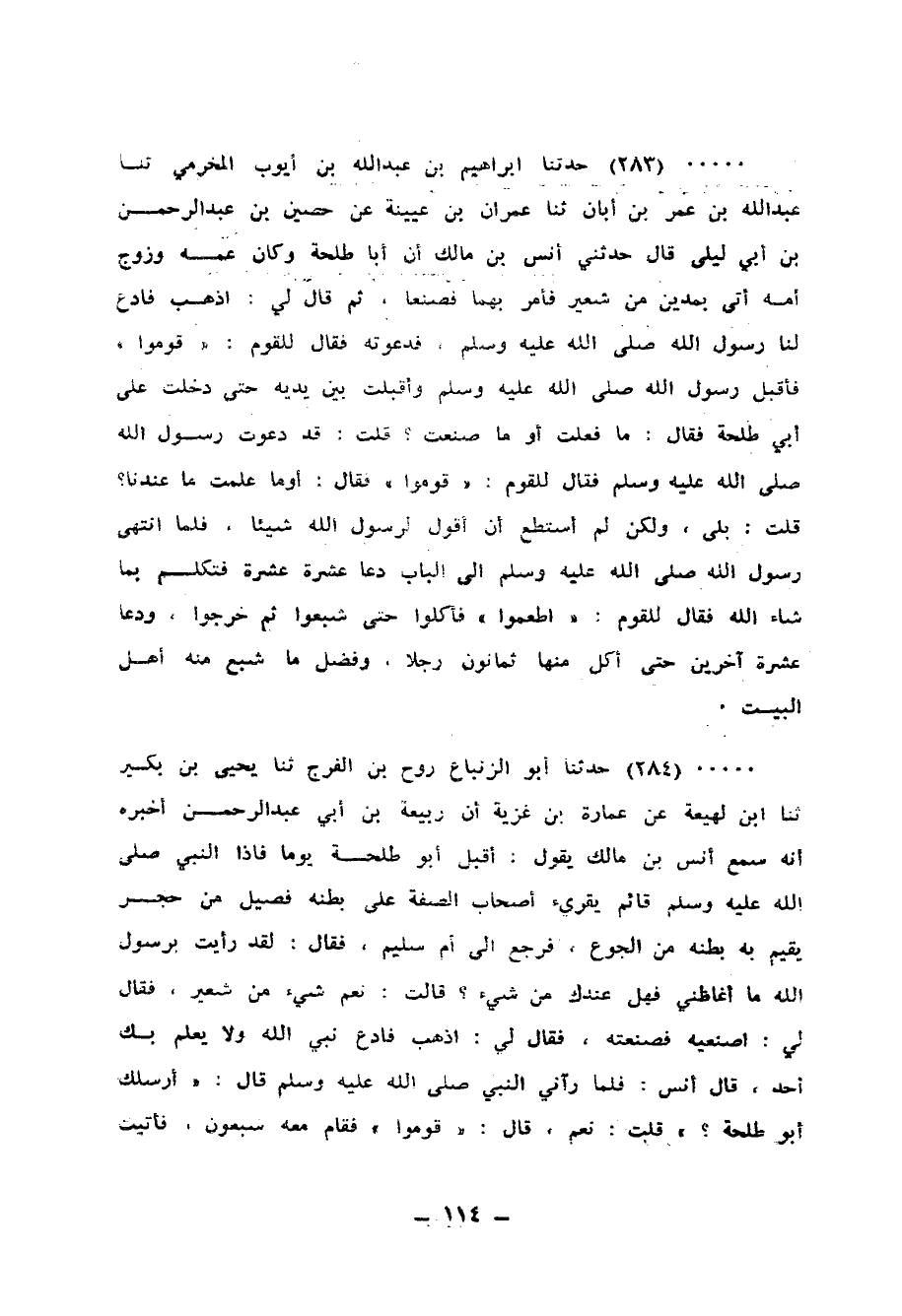 283 - حَدَّثَنَا إِبْرَاهِيمُ بْنُ عَبْدِ اللهِ بْنِ أَيُّوبَ الْمُخَرِّمِيُّ، ثنا عَبْدُ اللهِ بْنُ عُمَرَ بْنِ أَبَانَ، ثنا عِمْرَانُ بْنُ عُيَيْنَةَ، عَنْ حُصَيْنِ عَنْ عَبْدِ الرَّحْمَنِ بْنِ أَبِي لَيْلَى، قَالَ: حَدَّثَنِي أَنَسُ بْنُ مَالِكٍ: أَنَّ أَبَا طَلْحَةَ، وَكَانَ عَمَّهُ وَزَوْجَ أُمِّهِ " §أَتَى بِمُدَّيْنِ مِنْ شَعِيرٍ، فَأَمَرَ بِهِمَا، فَصُنِعَا، ثُمَّ قَالَ لِيَ اذْهَبْ فَادْعُ لَنَا رَسُولَ اللهِ صَلَّى اللهُ عَلَيْهِ وَسَلَّمَ فَدَعَوْتُهُ، فَقَالَ لِلْقَوْمِ: قُومُوا فأَقْبَلَ رَسُولُ اللهِ صَلَّى اللهُ عَلَيْهِ وَسَلَّمَ وَأَقْبَلْتُ بَيْنَ يَدَيْهِ حَتَّى دَخَلْتُ عَلَى أَبِي طَلْحَةَ، فَقَالَ: مَا فَعَلْتَ أَوْ مَا صَنَعْتَ؟ قُلْتُ: قَدْ دَعَوْتُ رَسُولَ اللهِ صَلَّى اللهُ عَلَيْهِ وَسَلَّمَ، فَقَالَ لِلْقَوْمِ: قُومُوا، فَقَالَ: أَوَ مَا عَلِمْتَ مَا عِنْدَنَا؟ قُلْتُ: بَلَى وَلَكِنْ لَمْ أَسْتَطِعْ أَنْ أَقُولَ لِرَسُولِ اللهِ شَيْئًا فَلَمَّا انْتَهَى رَسُولُ اللهِ صَلَّى اللهُ عَلَيْهِ وَسَلَّمَ إِلَى الْبَابِ دَعَا عَشَرَةً عَشَرَةً، فَتَكَلَّمَ بِمَا شَاءَ اللهُ، فَقَالَ لِلْقَوْمِ: اطْعَمُوا فَأَكَلُوا حَتَّى شَبِعُوا ثُمَّ خَرَجُوا، وَدَعَا عَشَرَةً آخَرِينَ حَتَّى أَكَلَ مِنْهَا ثَمَانُونَ رَجُلًا، وَفَضَلَ مَا شَبِعَ مِنْهُ أَهْلُ الْبَيْتِ "