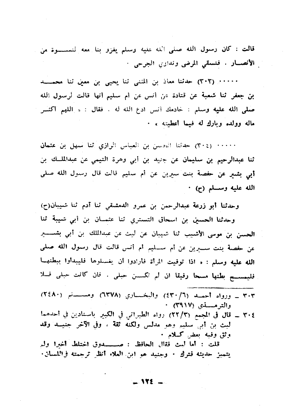 304 - حَدَّثَنَا الْحَسَنُ بْنُ الْعَبَّاسِ الرَّازِيُّ، ثنا سَهْلُ بْنُ عُثْمَانَ، ثنا عَبْدُ الرَّحِيمِ بْنُ سُلَيْمَانَ، عَنْ جُنَيْدِ بْنِ أَبِي وَهْرَةَ التَّيْمِيِّ، عَنْ عَبْدِ الْمَلِكِ بْنِ أَبِي بَشِيرٍ، عَنْ حَفْصَةَ بِنْتِ سِيرِينَ، عَنْ أُمِّ سُلَيْمٍ، قَالَتْ: قَالَ رَسُولُ اللهِ صَلَّى اللهُ عَلَيْهِ وَسَلَّمَ، ح وَحَدَّثَنَا أَبُو زُرْعَةَ عَبْدُ الرَّحْمَنِ بْنُ عَمْرٍو الدِّمَشْقِيُّ، ثنا آدَمُ، ثنا شَيْبَانُ، ح وَحَدَّثَنَا الْحُسَيْنُ بْنُ إِسْحَاقَ التُّسْتَرِيُّ، ثنا عُثْمَانُ بْنُ أَبِي شَيْبَةَ، ثنا الْحَسَنُ بْنُ مُوسَى الْأَشْيَبُ، ثنا شَيْبَانُ، عَنْ لَيْثٍ، عَنْ عَبْدِ الْمَلِكِ بْنِ أَبِي بَشِيرٍ، عَنْ حَفْصَةَ بِنْتِ سِيرِينَ، عَنْ أُمِّ سُلَيْمٍ أُمِّ أَنَسٍ قَالَتْ: قَالَ رَسُولُ اللهِ صَلَّى اللهُ عَلَيْهِ وَسَلَّمَ: «إِذَا §تُوُفِّيَتِ الْمَرْأَةُ، فَأَرَادُوا أَنْ يُغَسِّلُوهَا، فَلْيَبْدَأُوا بِبَطْنِهَا، فَلْيُمْسَحْ بَطْنُهَا مَسْحًا رَفِيقًا، إِنْ لَمْ تَكُنْ حُبْلَى، فَإِنْ كَانَتْ حُبْلَى، فَلَا -[125]- تُحَرِّكْنَهَا فَإِنْ أَرَدْتِ غَسْلَهَا، فَابْدَئِي بِسِفْلَيْهَا، فَأَلْقِي عَلَى عَوْرَتِهَا ثَوْبًا سِتِّيرًا، ثُمَّ خُذِي كُرْسُفَةً فَاغْسِلِيهَا فَأَحْسِنِي غَسْلَهَا، ثُمَّ أَدْخِلِي يَدَكِ مِنْ تَحْتِ الثَّوْبِ فَامْسَحِيهَا بِكُرْسُفٍ ثَلَاثَ مَرَّاتٍ، فَأَحْسِنِي مَسْحَهَا قَبْلَ أَنْ تُوَضِّئِيهَا، ثُمَّ وَضِّئِيهَا بِمَاءٍ فِيهِ سِدْرٌ، وَلْتَفْرُغِ الْمَاءَ امْرَأَةٌ وَهِيَ قَائِمَةٌ لَا تَلِي شَيْئًا غَيْرَهُ حَتَّى تَنَّقِي بِالسِّدْرِ وَأَنْتِ تَغْسِلِينَ، وَلْيَلِ غُسْلَهَا أَوْلَى النِّسَاءِ بِهَا، وَإِلَّا فَامْرَأَةٌ وَرِعَةٌ، فَإِنْ كَانَتْ صَغِيرَةً أَوْ ضَعِيفَةً فَلْتَلِهَا امْرَأَةٌ وَرِعَةٌ مُسْلِمَةٌ، فَإِذَا فَرَغَتْ مِنْ غَسْلِ سَفِلَتِها غَسْلًا نَقِيًّا بِمَاءٍ وَسِدْرٍ، فَلْتُوَضِّئْهَا وُضُوءَ الصَّلَاةِ، فَهَذَا بَيَانُ وَضُوئِهَا ثُمَّ اغْسِلِيهَا بَعْدَ ذَلِكَ ثَلَاثَ مَرَّاتٍ بِمَاءٍ وَسِدْرٍ، فَابْدَئِي بِرَأْسِهَا قَبْلَ كُلِّ شَيْءٍ، فَأَنْقِي غُسْلَهُ مِنَ السِّدْرِ بِالْمَاءِ، وَلَا تُسَرِّحِي رَأْسَهَا بِمُشْطٍ، فَإِنْ حَدَثَ بِهَا حَدَثٌ بَعْدَ الْغَسَلَاتِ الثَّلَاثِ، فَاجْعَلِيهَا خَمْسًا، فَإِنْ حَدَثَ فِي الْخَامِسَةِ، فَاجْعَلِيهَا سَبْعًا وَكُلُّ ذَلِكَ، فَلْيَكُنْ وِتْرًا بِمَاءٍ وَسِدْرٍ، فَإِنْ كَانَ فِي الْخَامِسَةِ أَوِ الثَّالِثَةِ، فَاجْعَلِي فِيهِ شَيْئًا مِنْ كَافُورٍ وَشَيْئًا مِنْ سِدْرٍ، ثُمَّ اجْعَلِي ذَلِكَ فِي جَرٍّ جَدِيدٍ، ثُمَّ أَقْعِدِيهَا، فَأَفْرِغِي عَلَيْهَا وَابْدَئِي بِرَأْسِهَا حَتَّى تَبْلُغِي رِجْلَيْهَا، فَإِذَا فَرَغْتِ مِنْهَا، فَأَلْقِي عَلَيْهَا ثَوْبًا نَظِيفًا ثُمَّ أَدْخِلِي يَدَكِ مِنْ وَرَاءِ الثَّوْبِ فَانْزِعِيهِ عَنْهَا، ثُمَّ احْشِي سَفِلَتَهَا كُرْسُفًا مَا اسْتَطَعْتِ وَاحْشِي كُرْسُفَهَا مِنْ طِيبِهَا، ثُمَّ خُذِي سَبِيَّةُ طَوِيلَةً مَغْسُولَةُ، فَارْبِطِيهَا عَلَى عَجُزِهَا كَمَا تُرْبَطُ عَلَى النِّطَاقِ، ثُمَّ اعْقِدِيهَا بَيْنَ فَخِذَيْهَا وَضُمِّي فَخِذَيْهَا، ثُمَّ أَلْقِي طَرَفَ السَّبِيَّةِ عَنْ عَجُزِهَا إِلَى قَرِيبٍ مِنْ رُكْبَتَيْهَا، فَهَذَا شَأْنُ سَفِلَتِهَا ثُمَّ طَيِّبِيهَا وَكَفِّنِيهَا وَاطْوِي شَعْرَهَا ثَلَاثَةَ أَقْرُنٍ قَصَّةً وَقَرْنَيْنِ وَلَا تُشَبِّهِيهَا بِالرِّجَالِ، وَلْيَكُنْ كَفَنُهَا فِي خَمْسَةِ أَثْوَابٍ أَحَدُهَا الْإِزَارُ تَلُفِّي بِهِ، فَخِذَيْهَا وَلَا تَنْفُضِي مِنْ شَعْرِهَا شَيْئًا بِنَوْرَةٍ وَلَا غَيْرِهَا، وَمَا يَسْقُطُ مِنْ شَعْرِهَا، فَاغْسِلِيهِ، ثُ