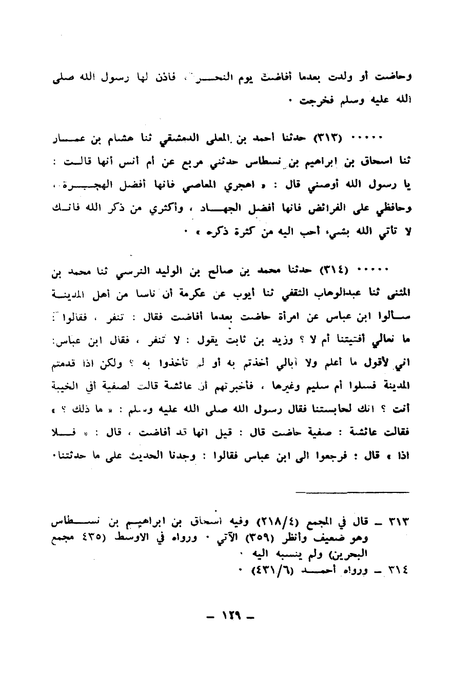 314 - حَدَّثَنَا مُحَمَّدُ بْنُ صَالِحِ بْنِ الْوَلِيدِ النَّرْسِيُّ، ثنا مُحَمَّدُ بْنُ الْمُثَنَّى، ثنا عَبْدُ الْوَهَّابِ الثَّقَفِيُّ، ثنا أَيُّوبُ، عَنْ عِكْرِمَةَ: أَنَّ " §نَاسًا مِنْ أَهْلِ الْمَدِينَةِ سَأَلُوا ابْنَ عَبَّاسٍ عَنِ امْرَأَةٍ حَاضَتْ بَعْدَمَا أَفَاضَتْ، فَقَالَ: تَنْفِرُ، فَقَالُوا: مَا نعالْي أَفْتَيْتَنَا أَمْ لَا، وَزَيْدُ بْنُ ثَابِتٍ يَقُولُ: لَا تَنْفِرُ، فَقَالَ ابْنُ عَبَّاسٍ: إِنِّي لَأَقُولُ مَا أَعْلَمُ وَلَا أُبَالِي أَخَذْتُمْ بِهِ أَوْ لَمْ تَأْخُذُوا بِهِ، وَلَكِنْ إِذَا قَدِمْتُمُ الْمَدِينَةَ، فَسَلُوا أُمَّ سُلَيْمٍ وَغَيْرَهَا، فَأَخْبَرْتُهُمْ أَنَّ عَائِشَةَ قَالَتْ لِصَفِيَّةَ: أَفِي الْخَيْبَةِ أَنْتِ إِنَّكِ لَحَابِسَتُنَا، فَقَالَ رَسُولُ اللهِ صَلَّى اللهُ عَلَيْهِ وَسَلَّمَ: «مَا ذَلِكَ؟» ، فَقَالَتْ عَائِشَةُ: صَفِيَّةُ حَاضَتْ، قَالَ: قِيلَ إِنَّهَا قَدْ أَفَاضَتْ، قَالَ: فَلَا إِذًا، قَالَ: فَرَجَعُوا إِلَى ابْنِ عَبَّاسٍ فَقَالُوا: وَجَدْنَا الْحَدِيثَ عَلَى مَا حَدَّثَتْنَا "