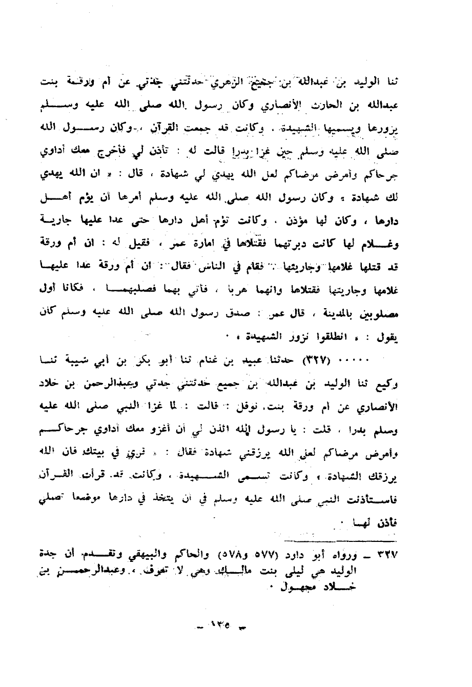 327 - حَدَّثَنَا عُبَيْدُ بْنُ غَنَّامٍ، ثنا أَبُو بَكْرِ بْنُ أَبِي شَيْبَةَ، ثنا وَكِيعٌ، ثنا الْوَلِيدُ بْنُ عَبْدِ اللهِ بْنِ جُمَيْعٍ، حَدَّثَتْنِي جَدَّتِي، وَعَبْدُ الرَّحْمَنِ بْنُ خَلَّادٍ الْأَنْصَارِيُّ، عَنْ أُمِّ وَرَقَةَ بِنْتِ نَوْفَلٍ، قَالَتْ: " §لَمَّا غَزَا النَّبِيُّ صَلَّى اللهُ عَلَيْهِ وَسَلَّمَ بَدْرًا قُلْتُ: يَا رَسُولَ اللهِ، ائْذَنْ لِي أَنْ أَغْزُوَ مَعَكَ أُدَاوِي جَرْحَاكُمْ، وَأُمَرِّضَ مَرْضَاكُمْ لَعَلَّ اللهُ يَرْزُقَنِي شَهَادَةً، فَقَالَ: قَرِّي فِي بَيْتِكِ، فَإِنَّ اللهَ يَرْزُقُكِ الشَّهَادَةَ، وَكَانَتْ تُسَمَّى الشَّهِيدَةَ، وَكَانَتْ قَدْ قَرَأَتِ الْقُرْآنَ، فَاسْتَأْذَنَتِ النَّبِيَّ صَلَّى اللهُ عَلَيْهِ وَسَلَّمَ فِي أَنْ يَتَّخِذَ فِي دَارِهَا مَوْضِعًا تُصَلِّي، فَأَذِنَ لَهَا "
