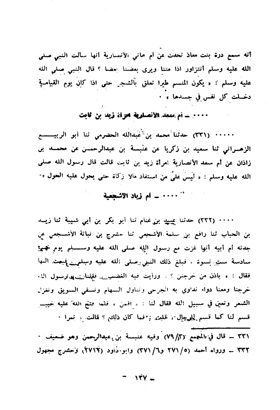 332 - حَدَّثَنَا عُبَيْدُ بْنُ غَنَّامٍ، ثنا أَبُو بَكْرِ بْنُ أَبِي شَيْبَةَ، ثنا زَيْدُ بْنُ الْحُبَابِ، ثنا رَافِعُ بْنُ سَلَمَةَ الْأَشْجَعِيُّ، ثنا حَشْرَجُ بْنُ نُبَاتَةَ الْأَشْجَعِيُّ، عَنْ جَدَّتِهِ أُمِّ أَبِيهِ، أَنَّهَا غَزَتْ مَعَ رَسُولِ اللهِ صَلَّى اللهُ عَلَيْهِ وَسَلَّمَ يَوْمَ خَيْبَرَ سَادِسَةَ سِتِّ نِسْوَةٍ، فَبَلَغَ ذَلِكَ النَّبِيَّ صَلَّى اللهُ عَلَيْهِ وَسَلَّمَ، فَبَعَثَ إِلَيْهَا، فَقَالَ: " §بِإِذْنِ مَنْ خَرَجْتُنَّ؟ وَرَأَيْتُ فِيهِ الْغَضَبَ، فَقُلْنَا: يَا رَسُولَ اللهِ خَرَجْنَا وَمَعَنَا دَوَاءٌ نُدَاوِي بِهِ الْجَرْحَى، وَنُنَاوِلُ السِّهَامَ، وَنَسْقِي السَّوِيقَ، وَنَغْزِلُ الشَّعْرَ وَنُعِينُ فِي سَبِيلِ اللهِ، فَقَالَ: لَنَا أَقِمْنَ فَلَمَّا فَتَحَ اللهُ عَلَيْهِ خَيْبَرَ قَسَمَ لَنَا كَمَا قَسَمَ لِلرِّجَالِ، قُلْتُ: فَمَا كَانَ ذَلِكَ؟ قَالَتْ: تَمْرًا "