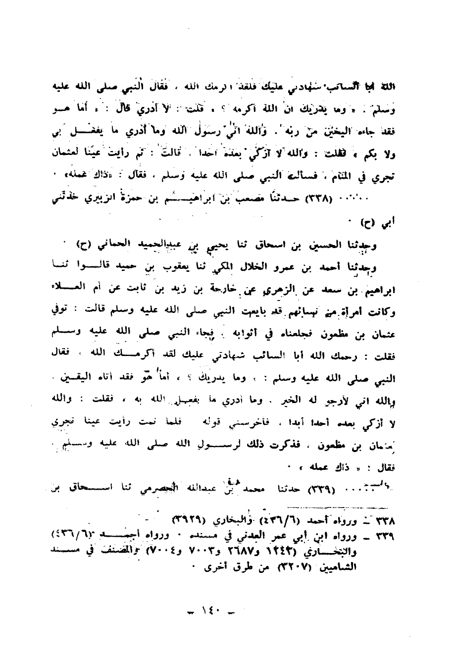 338 - حَدَّثَنَا مُصْعَبُ بْنُ إِبْرَاهِيمَ بْنِ حَمْزَةَ الزُّبَيْرِيُّ، حَدَّثَنِي أَبِي ح، وَحَدَّثَنَا الْحُسَيْنُ بْنُ إِسْحَاقَ، ثنا يَحْيَى بْنُ عَبْدِ الْحَمِيدِ الْحِمَّانِيُّ، ح وَحَدَّثَنَا أَحْمَدُ بْنُ عَمْرٍو الْخَلَّالُ الْمَكِّيُّ، ثنا يَعْقُوبُ بْنُ حُمَيْدٍ، قَالُوا: ثنا إِبْرَاهِيمُ بْنُ سَعْدٍ، عَنِ الزُّهْرِيِّ، عَنْ خَارِجَةَ بْنِ زَيْدِ بْنِ ثَابِتٍ، عَنْ أُمِّ الْعَلَاءِ، وَكَانَتِ امْرَأَةٌ مِنْ نِسَائِهِمْ قَدْ بَايَعَتِ النَّبِيَّ صَلَّى اللهُ عَلَيْهِ وَسَلَّمَ، قَالَتْ: " §تُوُفِّيَ عُثْمَانُ بْنُ مَظْعُونٍ فَجَعَلْنَاهُ فِي أَثْوَابِهِ، فَجَاءَ النَّبِيُّ صَلَّى اللهُ عَلَيْهِ وَسَلَّمَ، فَقُلْتُ: رَحِمَكَ اللهُ أَبَا السَّائِبِ شَهَادَتِي عَلَيْكَ، لَقَدْ أَكْرَمَكَ اللهُ، فَقَالَ النَّبِيُّ صَلَّى اللهُ عَلَيْهِ وَسَلَّمَ: «وَمَا يُدْرِيكَ أَمَّا هُوَ فَقَدْ أَتَاهُ الْيَقِينُ، وَاللهِ إِنِّي لَأَرْجُو لَهُ الْخَيْرَ وَمَا أَدْرِي مَا يَفْعَلُ اللهُ بِهِ» ، فَقُلْتُ: وَاللهِ لَا أُزَكِّي بَعْدَهُ أَحَدًا أَبَدًا فَأَخْرَسَنِي قَوْلُهُ، فَلَمَّا نِمْتُ رَأَيْتُ عَيْنًا تَجْرِي لِعُثْمَانَ بْنِ مَظْعُونٍ فَذَكَرْتُ ذَلِكَ لِرَسُولِ اللهِ صَلَّى اللهُ عَلَيْهِ وَسَلَّمَ، فَقَالَ: «ذَاكَ عَمَلُهُ»