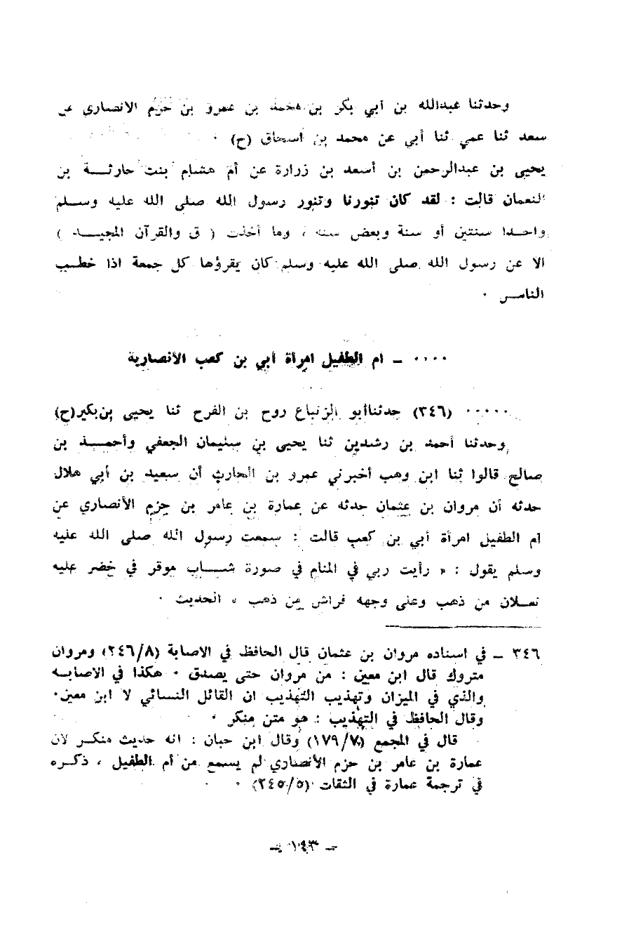 346 - حَدَّثَنَا أَبُو الزِّنْبَاعِ رَوْحُ بْنُ الْفَرَجِ، ثنا يَحْيَى بْنُ بُكَيْرٍ، ح وَحَدَّثَنَا أَحْمَدُ بْنُ رِشْدِينَ، ثنا يَحْيَى بْنُ سُلَيْمَانَ الْجُعْفِيُّ، وَأَحْمَدُ بْنُ صَالِحٍ، قَالُوا: ثنا ابْنُ وَهْبٍ، أَخْبَرَنِي عَمْرُو بْنُ الْحَارِثِ، أَنَّ سَعِيدَ بْنَ أَبِي هِلَالٍ، حَدَّثَهُ أَنَّ مَرْوَانَ بْنَ عُثْمَانَ، حَدَّثَهُ عَنْ عُمَارَةَ بْنِ عَامِرِ بْنِ حَزْمٍ الْأَنْصَارِيِّ، عَنْ أُمِّ الطُّفَيْلِ، امْرَأَةِ أُبَيِّ بْنِ كَعْبٍ قَالَتْ: سَمِعْتُ رَسُولَ اللهِ صَلَّى اللهُ عَلَيْهِ وَسَلَّمَ، يَقُولُ: «§رَأَيْتُ رَبِّي فِي الْمَنَامِ فِي صُورَةِ شَابٍّ مُوَقَّرٍ فِي خَضِرٍ، عَلَيْهِ نَعْلَانِ مِنْ ذَهَبٍ، وَعَلَى وَجْهِهِ فِرَاشٌ مِنْ ذَهَبٍ» الْحَدِيثَ