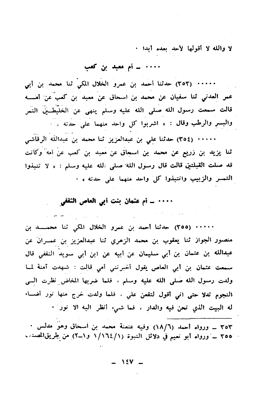 354 - حَدَّثَنَا عَلِيُّ بْنُ عَبْدِ الْعَزِيزِ، ثنا مُحَمَّدُ بْنُ عَبْدِ اللهِ الرَّقَاشِيُّ، ثنا يَزِيدُ بْنُ زُرَيْعٍ، عَنْ مُحَمَّدِ بْنِ إِسْحَاقَ، عَنْ مَعْبَدِ بْنِ كَعْبٍ، عَنْ أُمِّهِ، وَكَانَتْ قَدْ صَلَّتِ الْقِبْلَتَيْنِ، قَالَتْ: قَالَ رَسُولُ اللهِ صَلَّى اللهُ عَلَيْهِ وَسَلَّمَ:: §لَا تَنْبِذُوا التَّمْرَ وَالزَّبِيبَ، وَانْتَبِذُوا كُلَّ وَاحِدٍ مِنْهُمَا عَلَى حِدَتِهِ "