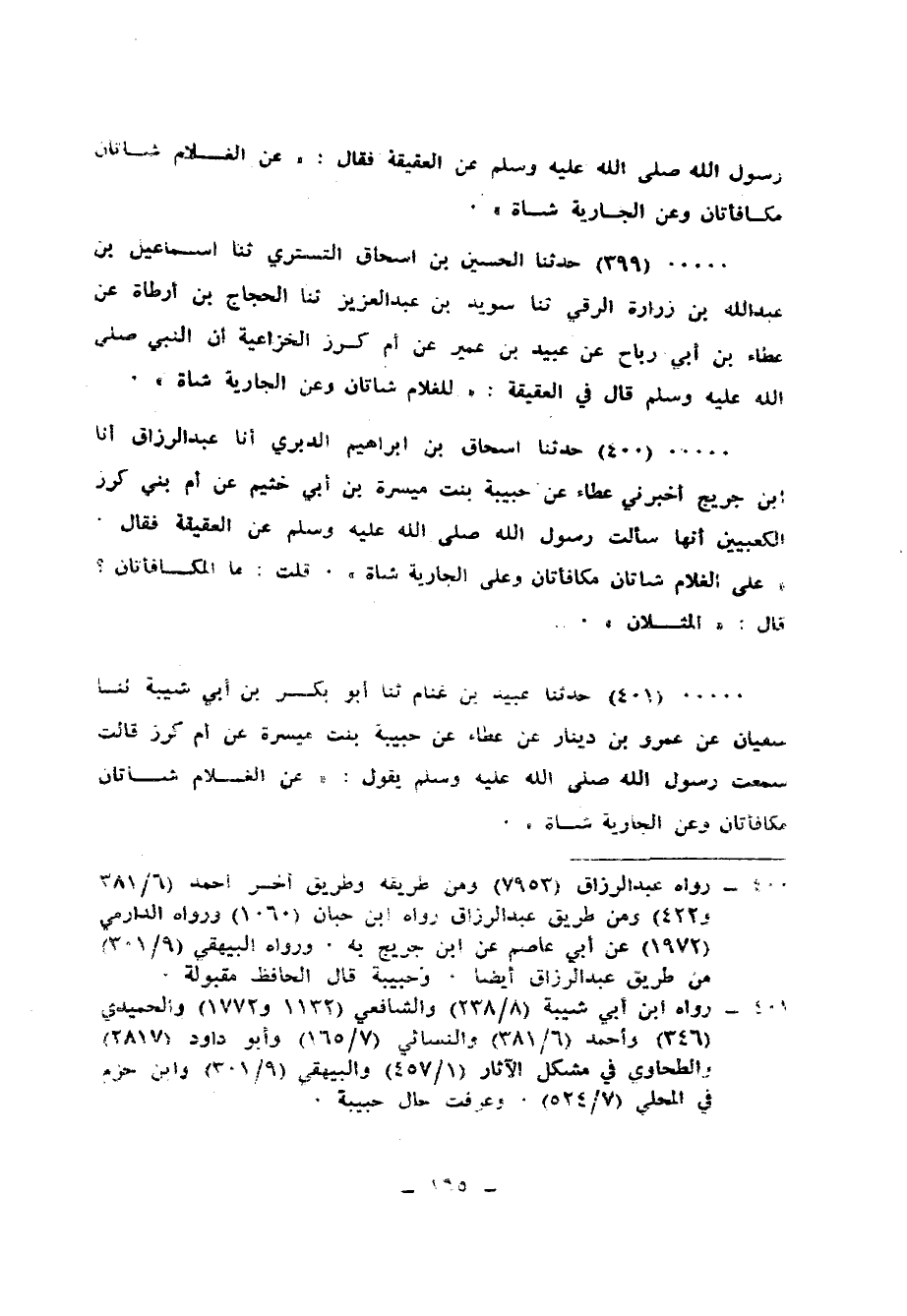 400 - حَدَّثَنَا إِسْحَاقُ بْنُ إِبْرَاهِيمَ الدَّبَرِيُّ، أنا عَبْدُ الرَّزَّاقِ، أنا ابْنُ جُرَيْجٍ، أَخْبَرَنِي عَطَاءٌ، عَنْ حَبِيبَةَ بِنْتِ مَيْسَرَةَ بْنِ أَبِي خُثَيْمٍ، عَنْ أُمِّ بَنِي كُرْزِ الْكَعْبِيِّينَ: أَنَّهَا سَأَلَتْ رَسُولَ اللهِ صَلَّى اللهُ عَلَيْهِ وَسَلَّمَ عَنِ الْعَقِيقَةِ، فَقَالَ: " §عَلَى الْغُلَامِ شَاتَانِ مُكَافَأَتَانِ، وَعَلَى الْجَارِيَةِ شَاةٌ. قُلْتُ: مَا الْمُكَافَأَتَانِ؟ قَالَ: الْمِثْلَانِ "