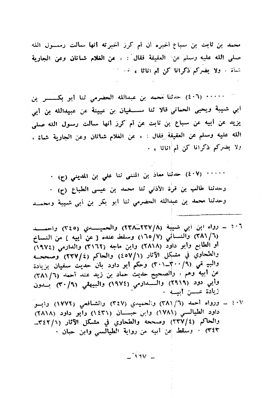 406 - حَدَّثَنَا مُحَمَّدُ بْنُ عَبْدِ اللهِ الْحَضْرَمِيُّ، ثنا أَبُو بَكْرِ بْنُ أَبِي شَيْبَةَ وَيَحْيَى الْحِمَّانِيُّ، قَالَا: ثنا سُفْيَانُ بْنُ عُيَيْنَةَ، عَنْ عُبَيْدِ اللهِ بْنِ أَبِي يَزِيدَ، عَنْ أَبِيهِ، عَنْ سِبَاعِ بْنِ ثَابِتٍ، عَنْ أُمِّ كُرْزٍ: أَنَّهَا سَأَلَتْ رَسُولَ اللهِ صَلَّى اللهُ عَلَيْهِ وَسَلَّمَ عَنِ الْعَقِيقَةِ، فَقَالَ: «§عَنِ الْغُلَامِ شَاتَانِ، وَعَنِ الْجَارِيَةِ شَاةٌ، وَلَا يَضُرُّكُمْ ذُكْرَانًا كُنَّ أَمْ إِنَاثًا»