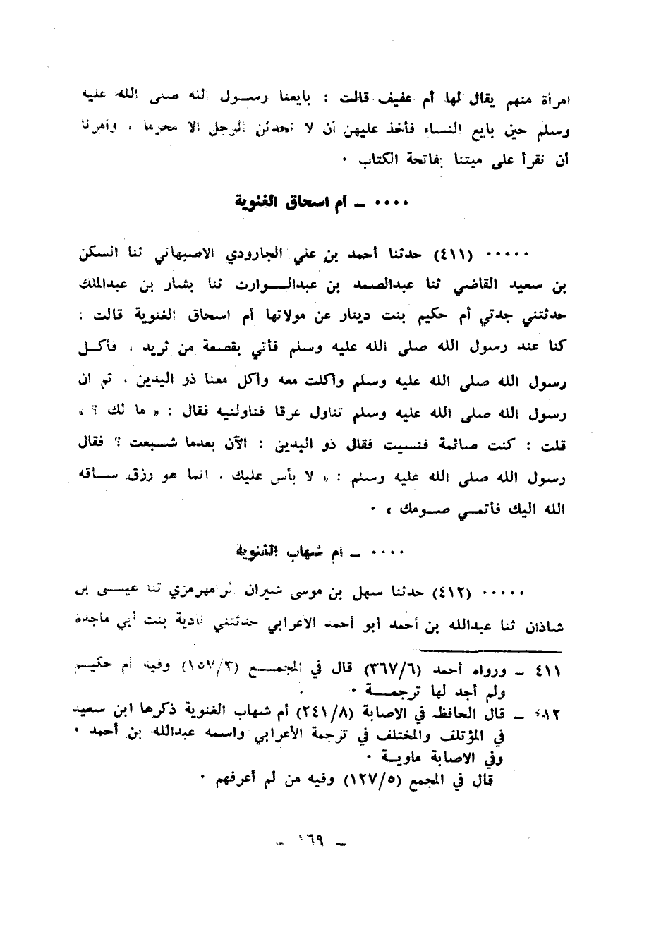 412 - حَدَّثَنَا سَهْلُ بْنُ مُوسَى شِيرَانُ الرَّامَهُرْمُزِيُّ، ثنا عِيسَى بْنُ شَاذَانَ، ثنا عَبْدُ اللهِ بْنُ أَحْمَدَ أَبُو أَحْمَدَ الْأَعْرَابِيُّ، حَدَّثَتْنِي نَادِيَةٌ بِنْتُ أَبِي مَاجِدَةَ، قَالَتْ: حَدَّثَتْنِي مَوْلَاتِي أُمُّ شِهَابٍ الْغَنَوِيَّةُ، قَالَتْ: «§أَتَيْتُ رَسُولَ اللهِ صَلَّى اللهُ عَلَيْهِ وَسَلَّمَ، فَأَمَرَ لِي بِسَوِيقٍ مِنْ شَعِيرٍ وَكَسَانِي كِسَاءً»