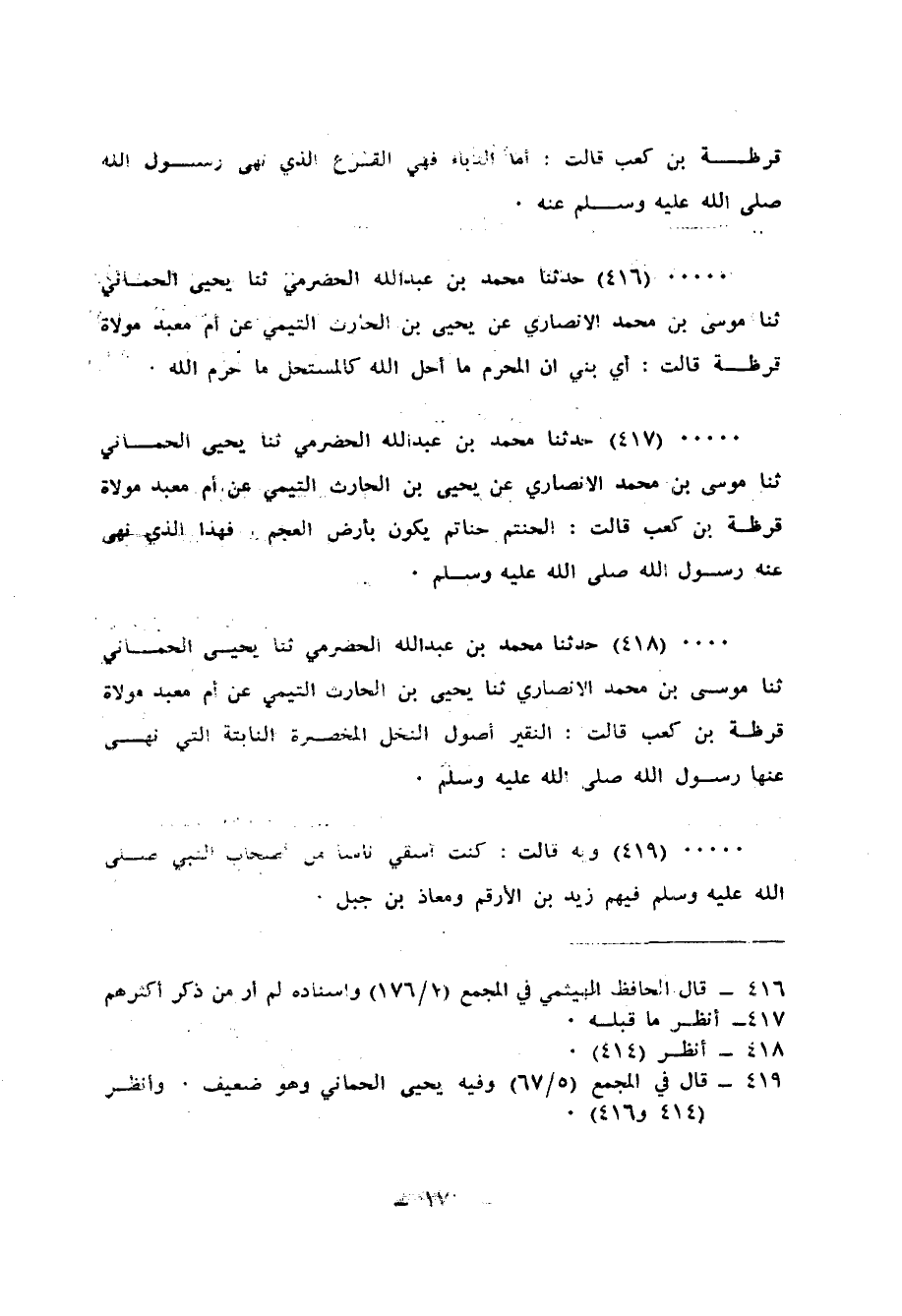 417 - حَدَّثَنَا مُحَمَّدُ بْنُ عَبْدِ اللهِ الْحَضْرَمِيُّ، ثنا يَحْيَى الْحِمَّانِيُّ، ثنا مُوسَى بْنُ مُحَمَّدٍ الْأَنْصَارِيُّ، عَنْ يَحْيَى بْنِ الْحَارِثِ التَّيْمِيِّ، عَنْ أُمِّ مَعْبَدٍ مَوْلَاةِ قَرَظَةَ بْنِ كَعْبٍ، قَالَتْ: «§الْحَنْتَمُ حَنَاتِمُ، يَكُونُ بِأَرْضِ الْعَجَمِ، فَهَذَا الَّذِي نَهَى عَنْهُ رَسُولُ اللهِ صَلَّى اللهُ عَلَيْهِ وَسَلَّمَ»