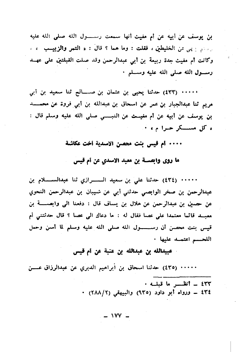 435 - حَدَّثَنَا إِسْحَاقُ بْنُ إِبْرَاهِيمَ الدَّبَرِيُّ، عَنْ عَبْدِ الرَّزَّاقِ، عَنْ مَعْمَرٍ، وَابْنِ جُرَيْجٍ، وَابْنِ عُيَيْنَةَ، عَنِ الزُّهْرِيِّ قَالَ: أَخْبَرَنِي عُبَيْدُ اللهِ بْنُ عَبْدِ اللهِ بْنِ عُتْبَةَ: أَنَّ أُمَّ قَيْسٍ بِنْتَ مِحْصَنٍ وَكَانَتْ مِنَ الْمُهَاجِرَاتِ الْأُوَلِ اللَّاتِي بَايَعْنَ رَسُولَ اللهِ صَلَّى اللهُ عَلَيْهِ وَسَلَّمَ، فَأَخْبَرَتْنِي أَنَّهَا أَتَتْ رَسُولَ اللهِ صَلَّى اللهُ عَلَيْهِ وَسَلَّمَ بِابْنٍ لَهَا لَمْ يَبْلُغْ أَنْ يَأْكُلَ الطَّعَامَ، وَقَدْ أَعْلَقَتْ عَلَيْهِ مِنَ الْعُذْرَةِ، فَقَالَ رَسُولُ اللهِ صَلَّى اللهُ عَلَيْهِ وَسَلَّمَ: " §عَلَى مَ تَدَعُنَّ أَوْلَادَكُنَّ بِهَذِهِ الْعَلَائِقِ، عَلَيْكُمْ بِهَذِهِ الْعُودِ الْهِنْدِيِّ يَعْنِي الْقُسْطَ، فَإِنَّ فِيهِ سَبْعَةَ أَشْفِيَةٍ مِنْهَا ذَاتُ الْجَنْبِ. قَالَ: عُبَيْدُ اللهِ: فَأَخْبَرَتْنِي أُمُّ قَيْسٍ أَنَّ ابْنَهَا بَالَ فِي حِجْرِ النَّبِيِّ صَلَّى اللهُ عَلَيْهِ وَسَلَّمَ، فَدَعَا رَسُولُ اللهِ صَلَّى اللهُ عَلَيْهِ وَسَلَّمَ بِمَاءٍ، فَصَبَّهُ عَلَى بَوْلِهِ، وَلَمْ يَغْسِلْهُ "
