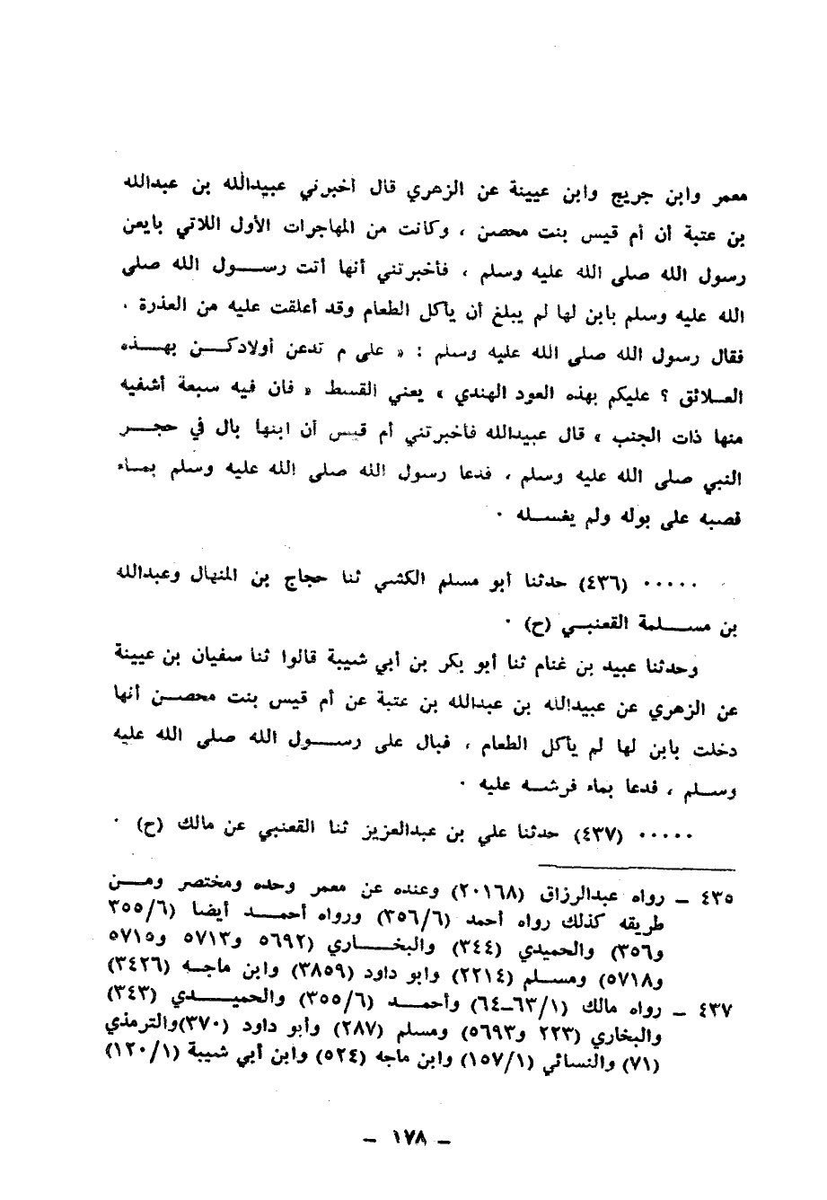 436 - حَدَّثَنَا أَبُو مُسْلِمٍ الْكَشِّيُّ، ثنا حَجَّاجُ بْنُ الْمِنْهَالِ، وَعَبْدُ اللهِ بْنُ مَسْلَمَةَ الْقَعْنَبِيُّ، ح وَحَدَّثَنَا عُبَيْدُ بْنُ غَنَّامٍ، ثنا أَبُو بَكْرِ بْنُ أَبِي شَيْبَةَ، قَالُوا: ثنا سُفْيَانُ بْنُ عُيَيْنَةَ، عَنِ الزُّهْرِيِّ، عَنْ عُبَيْدِ اللهِ بْنِ عَبْدِ اللهِ بْنِ عُتْبَةَ، عَنْ أُمِّ قَيْسِ بِنْتِ مِحْصَنٍ: أَنَّهَا «§دَخَلَتْ بِابْنٍ لَهَا لَمْ يَأْكُلِ الطَّعَامَ، فَبَالَ عَلَى رَسُولِ اللهِ صَلَّى اللهُ عَلَيْهِ وَسَلَّمَ، فَدَعَا بِمَاءٍ فَرَشَّهُ عَلَيْهِ»