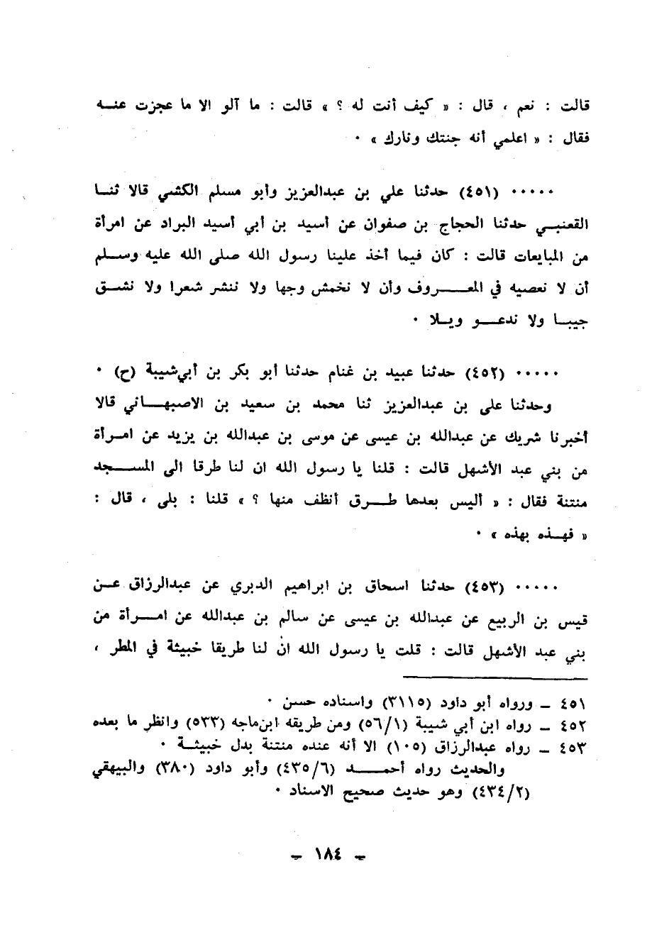 451 - حَدَّثَنَا عَلِيُّ بْنُ عَبْدِ الْعَزِيزِ، وَأَبُو مُسْلِمٍ الْكَشِّيُّ، قَالَا: ثنا الْقَعْنَبِيُّ، حَدَّثَنَا الْحَجَّاجُ بْنُ صَفْوَانَ، عَنْ أُسَيْدِ بْنِ أَبِي أُسَيْدٍ الْبَرَّادِ، عَنِ امْرَأَةٍ مِنَ الْمُبَايِعَاتِ قَالَتْ: كَانَ فِيمَا أَخَذَ عَلَيْنَا رَسُولُ اللهِ صَلَّى اللهُ عَلَيْهِ وَسَلَّمَ أَنْ: «§لَا نَعْصِيَهُ فِي الْمَعْرُوفِ، وَأَنْ لَا نَخْمِشَ وَجْهًا، وَلَا نَنْشُرَ شِعْرًا وَلَا نَشُقَّ جَيْبًا، وَلَا نَدْعُوَ وَيْلًا»