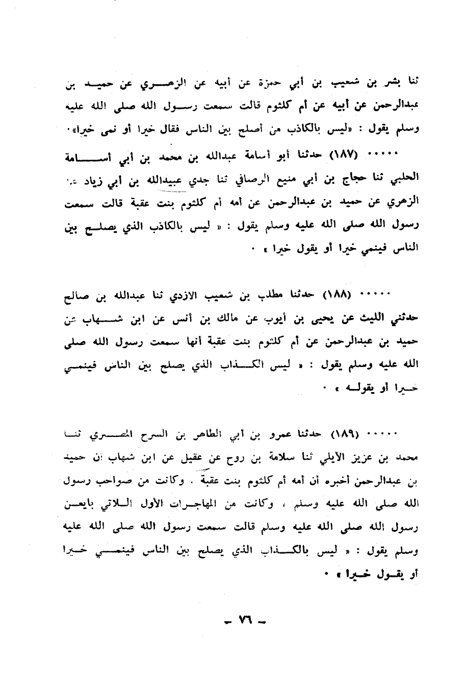 187 - حَدَّثَنَا أَبُو أُسَامَةَ عَبْدُ اللهِ بْنُ مُحَمَّدِ بْنِ أَبِي أُسَامَةَ الْحَلَبِيُّ، ثنا حَجَّاجُ بْنُ أَبِي مَنِيعٍ الرُّصَافِيُّ، ثنا جَدِّي عُبَيْدُ اللهِ بْنُ أَبِي زِيَادٍ عَنِ الزُّهْرِيِّ، عَنْ حُمَيْدِ بْنِ عَبْدِ الرَّحْمَنِ، عَنْ أُمِّهِ أُمِّ كُلْثُومٍ بِنْتِ عُقْبَةَ، قَالَتْ: سَمِعْتُ رَسُولَ اللهِ صَلَّى اللهُ عَلَيْهِ وَسَلَّمَ، يَقُولُ: «§لَيْسَ بِالْكَاذِبِ الَّذِي يُصْلِحُ بَيْنَ النَّاسِ، فَيَنْمِي خَيْرًا، أَوْ يَقُولُ خَيْرًا»