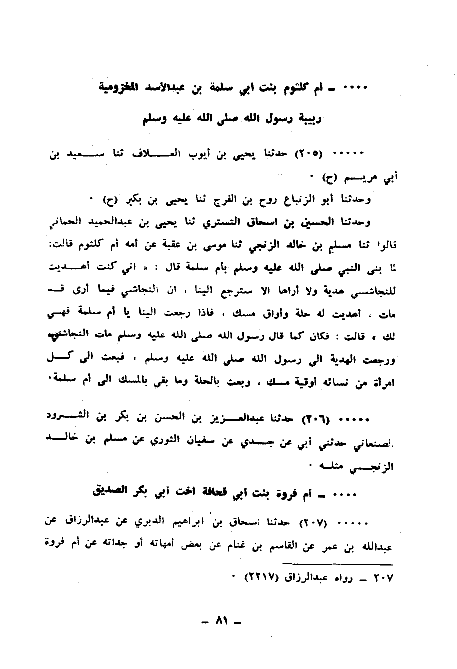 205 - حَدَّثَنَا يَحْيَى بْنُ أَيُّوبَ الْعَلَّافُ، ثنا سَعِيدُ بْنُ أَبِي مَرْيَمَ، ح وَحَدَّثَنَا أَبُو الزِّنْبَاعِ رَوْحُ بْنُ الْفَرَجِ، ثنا يَحْيَى بْنُ بُكَيْرٍ، ح وَحَدَّثَنَا الْحُسَيْنُ بْنُ إِسْحَاقَ التُّسْتَرِيُّ، ثنا يَحْيَى بْنُ عَبْدِ الْحَمِيدِ الْحِمَّانِيُّ، قَالُوا: ثنا مُسْلِمُ بْنُ خَالِدٍ الزَّنْجِيُّ، ثنا مُوسَى بْنُ عُقْبَةَ، عَنْ أُمِّهِ أُمِّ كُلْثُومٍ، قَالَتْ: لَمَّا بَنَى النَّبِيُّ صَلَّى اللهُ عَلَيْهِ وَسَلَّمَ بِأُمِّ سَلَمَةَ، قَالَ: " §إِنِّي كُنْتُ أَهْدَيْتُ لِلنَّجَاشِيِّ هَدِيَّةً وَلَا أُرَاهَا إِلَّا سَتَرْجِعُ إِلَيْنَا أَنَّ النَّجَاشِيَّ، فِيمَا أَرَى قَدْ مَاتَ أَهْدَيْتُ لَهُ حُلَّةً وَأَوَاقِيَ مِسْكٍ، فَإِذَا رَجَعَتْ إِلَيْنَا يَا أُمَّ سَلَمَةَ فَهِيَ لَكِ، قَالَتْ: فَكَانَ كَمَا قَالَ رَسُولُ اللهِ صَلَّى اللهُ عَلَيْهِ وَسَلَّمَ، مَاتَ النَّجَاشِيُّ وَرَجَعَتِ الْهَدِيَّةُ إِلَى رَسُولِ اللهِ صَلَّى اللهُ عَلَيْهِ وَسَلَّمَ، فَبَعَثَ إِلَى كُلِّ امْرَأَةٍ مِنْ نِسَائِهِ أُوقِيَّةَ مِسْكٍ، وَبَعَثَ بِالْحُلَّةِ، وَمَا بَقِيَ بِالْمِسْكِ إِلَى أُمِّ سَلَمَةَ "،
